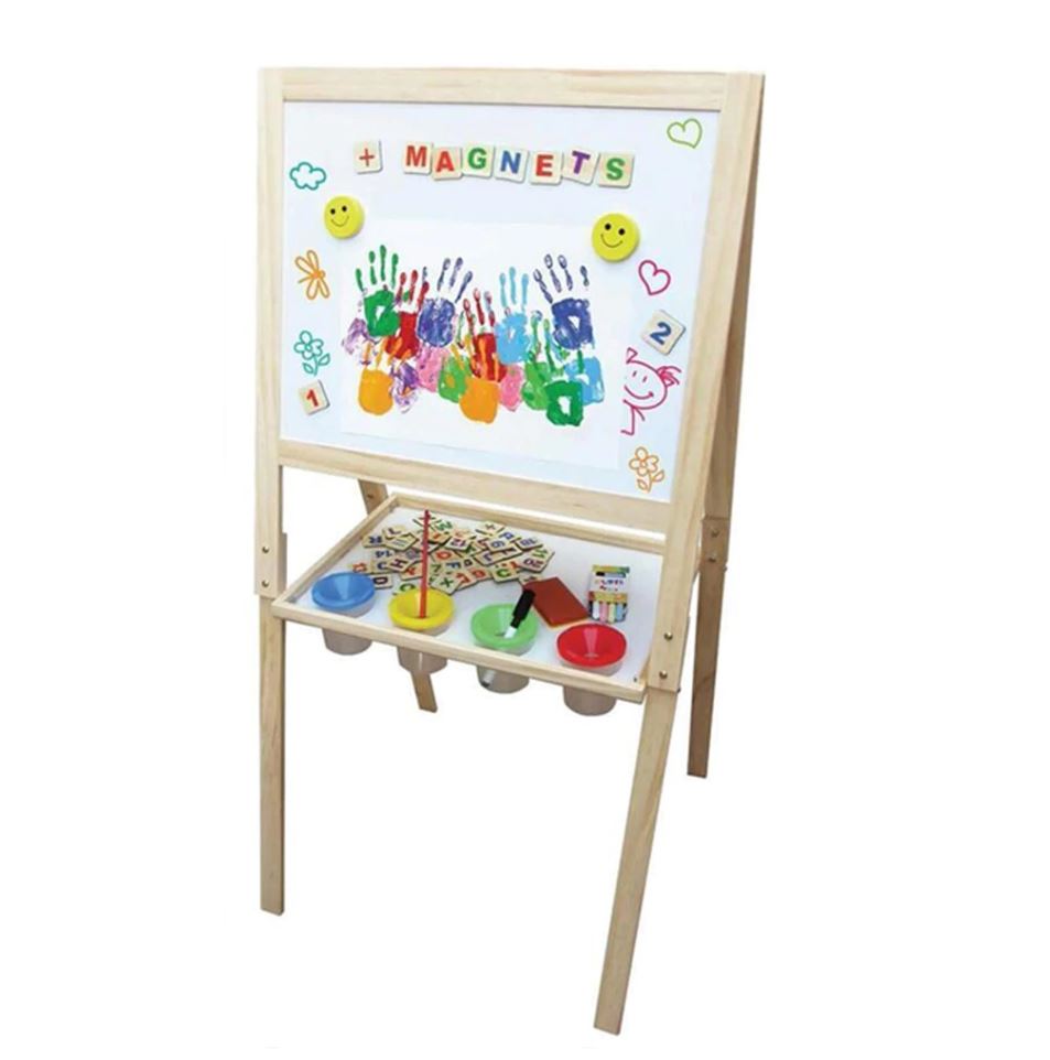 4 in 1 Wooden Easel. Includes a chalk board one side and magnetic white board the other. Includes 4 x paint pots, spill proof tray, chalk, white board marker, paper holders, magnetic letters, numbers and symbols. Assembled Size: 97cm high x 48cm wide