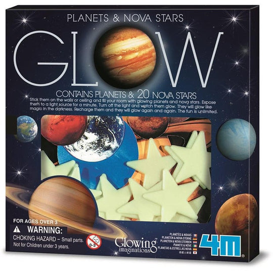 Transform any room into a glowing interplanetary display with the 4M Glow Planets and Nova Stars kit. This kit includes nine highly detailed paper planets and 20 soft foam stars and adhesive to safely attach them to any flat surface. Expose the objects to light for a full minute, then watch them glow softly in the darkness. The 4M Glow Planets and Nova stars are perfect for young space enthusiasts and can provide gentle illumination for children at night. Recommended for ages 3yrs+.