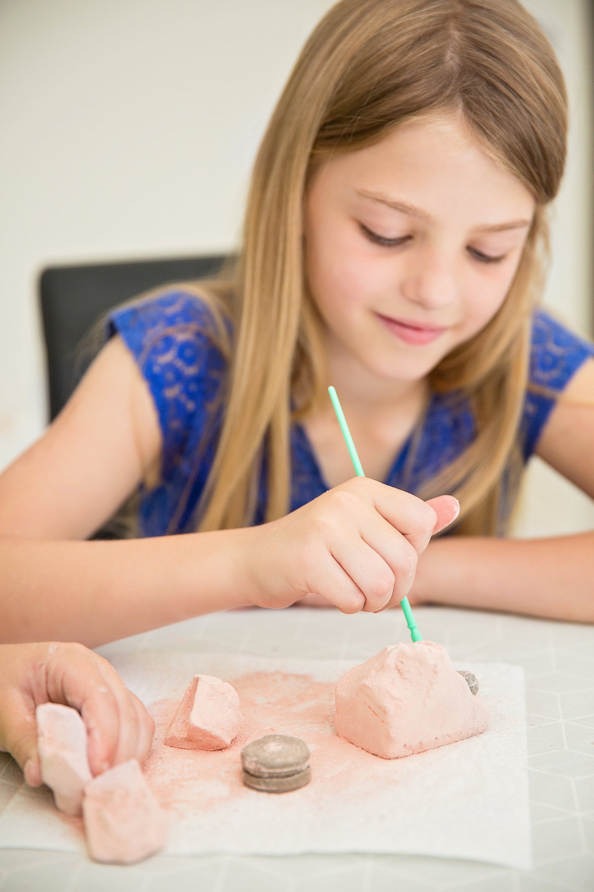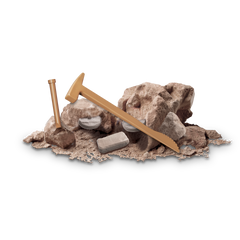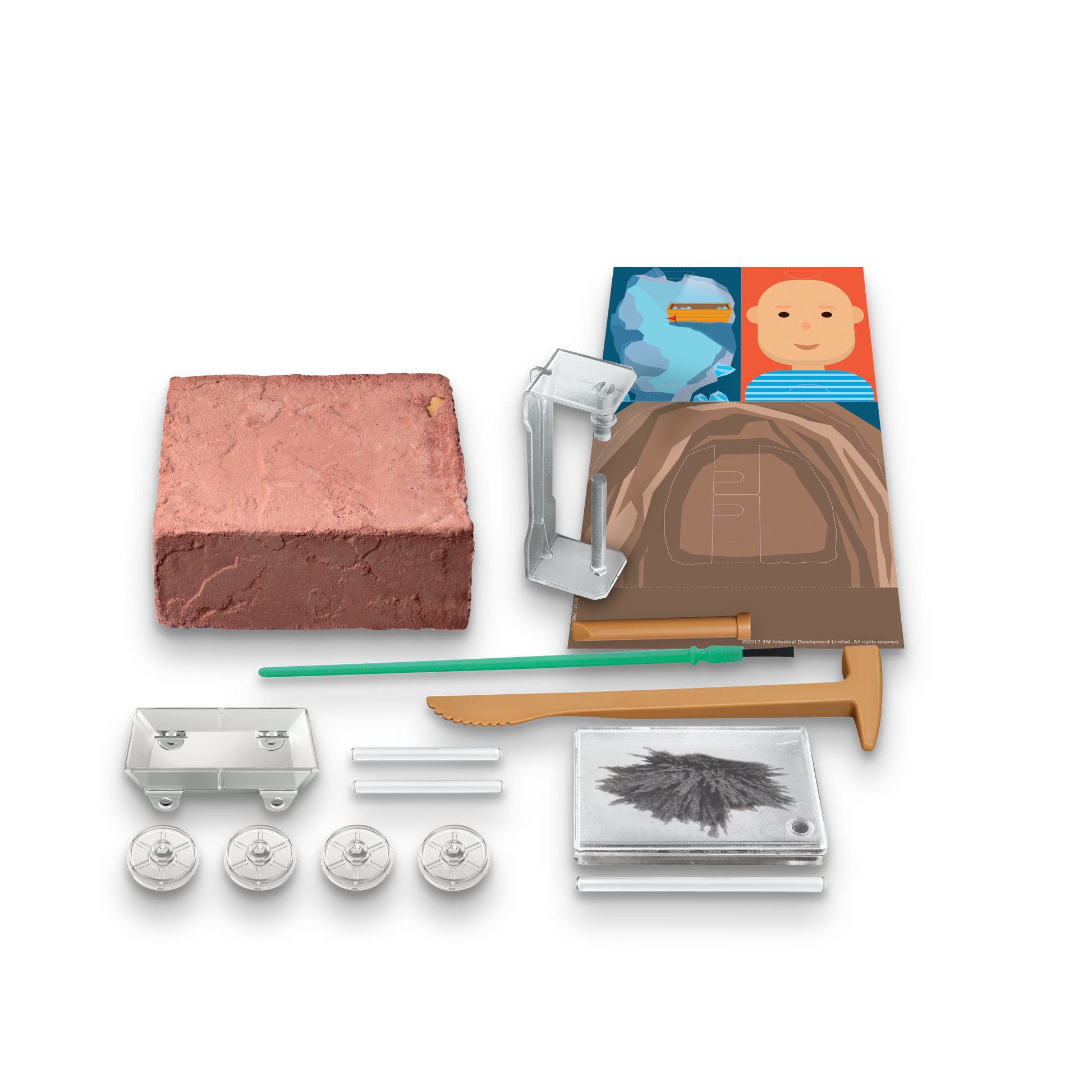 Plaster block, ring and bar magnets, set of digging tools and brush, case of iron powder, template, stand, mining cart body, wheels, axel, wand and instructions.
