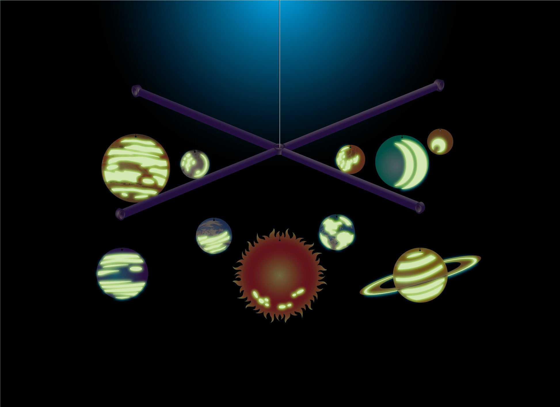 Make and hang your own 42cm x 42cm glow Solar System mobile. Watch it glow and revolve in the dark.Contains 1 set of cardboard Solar System planets, squeeze to draw glow paint, 1 set of stencils for applying glow paint, hanging structure including joints, rods and thread, detailed instructions and a bonus wall chart of fun facts about our Solar System. Contains small parts.