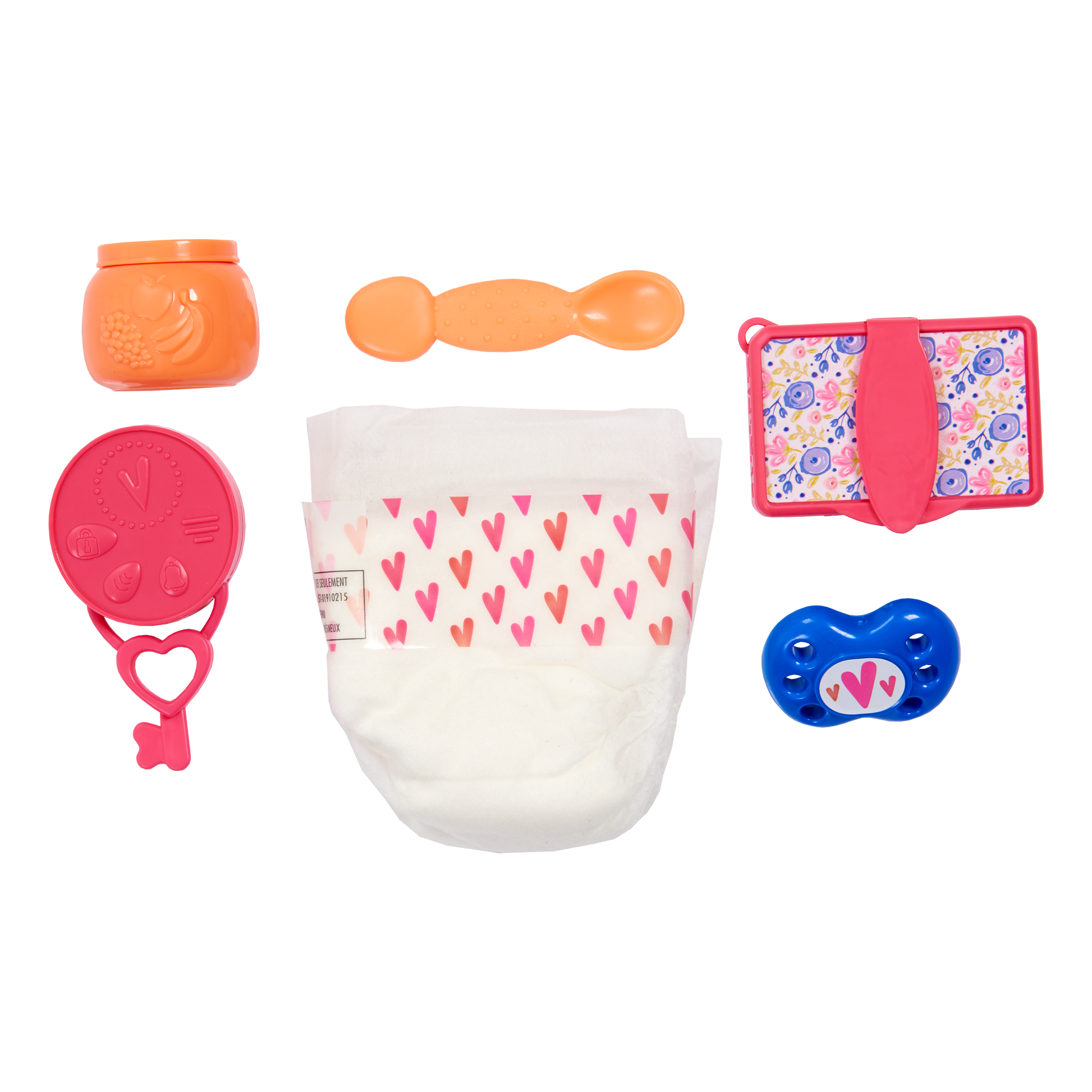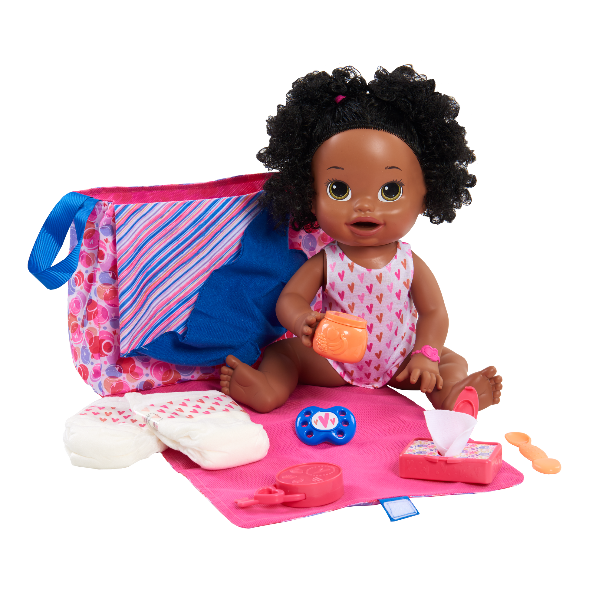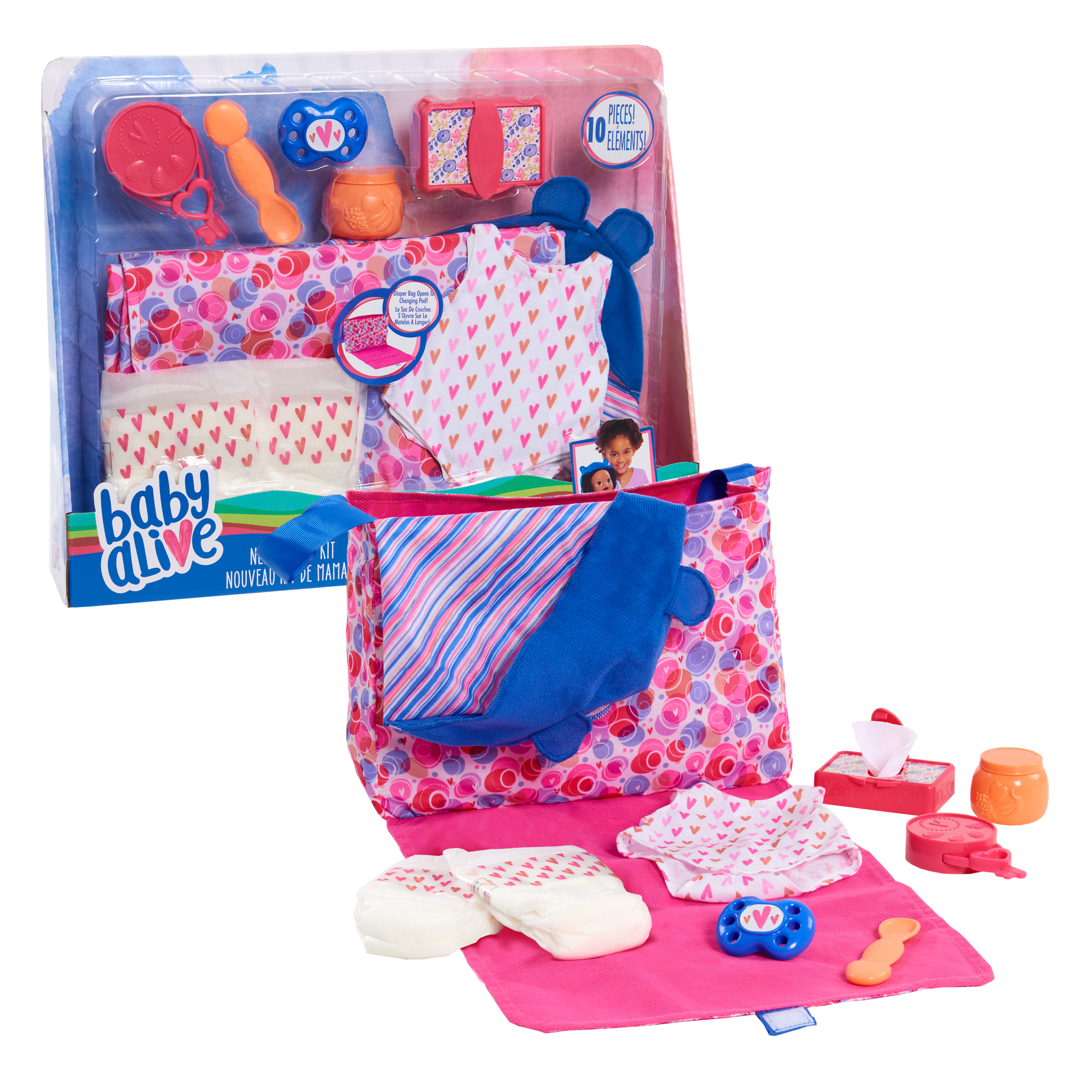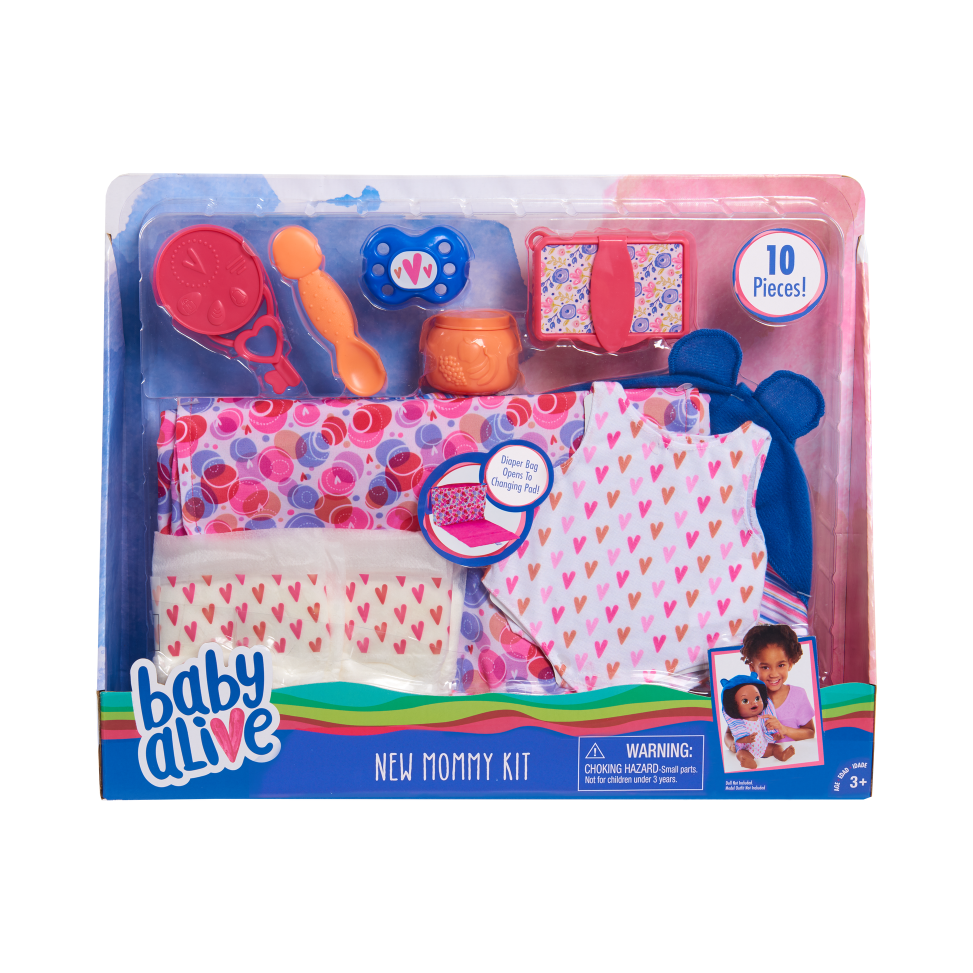 Now your little ones can pretend to be a real mommy with the Baby Alive New Mommy Kit. This adorable kit features a portable and stylish diaper bag which transforms into a changing pad for when baby needs a diaper change on the go! The bag features two-sided carrying straps for easy transport and can hold all nine mommy-essential accessories including: two diapers, one snack jar, one baby spoon, one pack of play baby wipes with wipes, a onesie, one swaddle blanket, one pacifier, and one play key ring for when baby is teething! Use the cute onesie, baby wipes, and diapers to change your baby when things get messy! Don't forget to wrap her up in the colorful swaddle blanket and give her the pacifier when she cries! Your little one will always be prepared to take care of her baby doll with the Baby Alive New Mommy Kit.