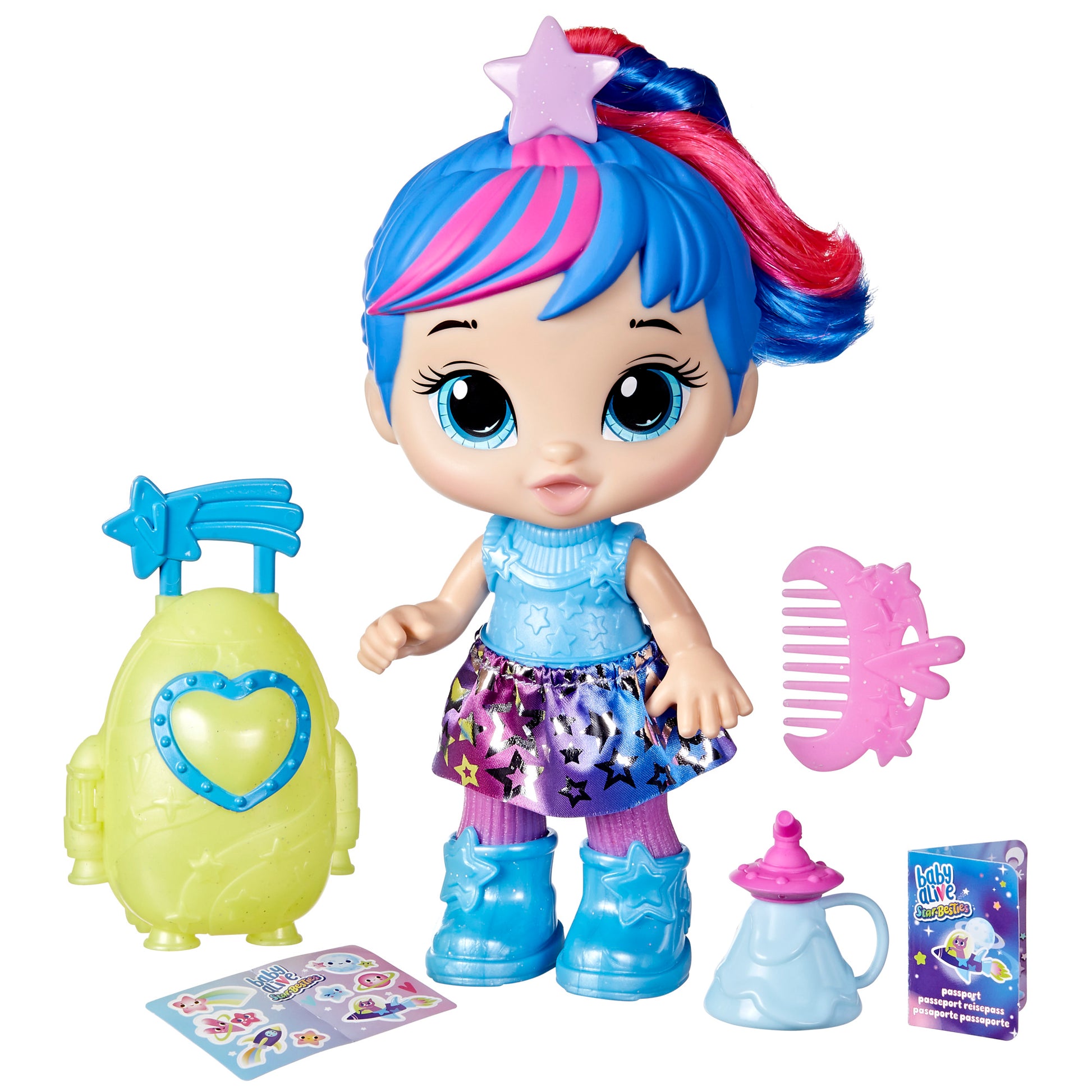 SPACE TRAVEL-INSPIRED DOLL AND ACCESSORIES: Features Baby Alive accessories, like a foil accent removable skirt. plus intergalactic accessories, including a spacey suitcase, planet passport, pretend drink, comb, and stickers