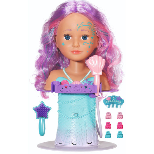 BABY born Sister Styling Mermaid Head with electronic shower head. Includes brush, tiara and 6 hair clips.