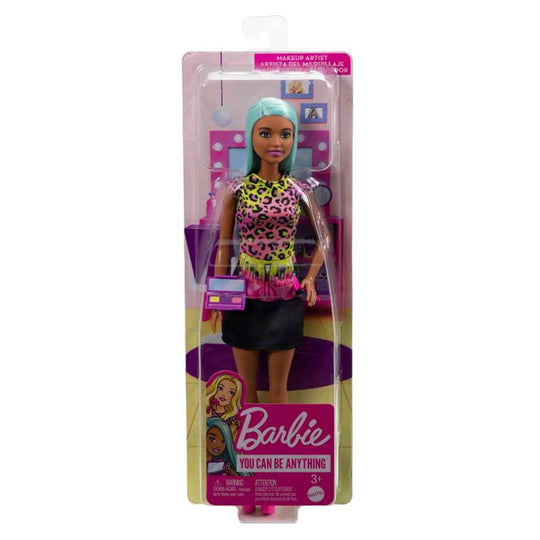 Makeup Artist Barbie doll is ready to give clients a new look with a print-on styling apron and makeover accessories. Wearing a fab look of her own, including wonder blue hair, a colorful leopard print top and pink platform shoes, Barbie makeup artist doll inspires kids ages 3 years old and up to explore their dreams. Doll cannot stand alone. Colors and decorations may vary.