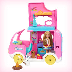 Kids can take Chelsea™ doll and her two pets on a road trip with the Barbie® Chelsea™ 2-in-1 Camper that transforms into a cool campsite!