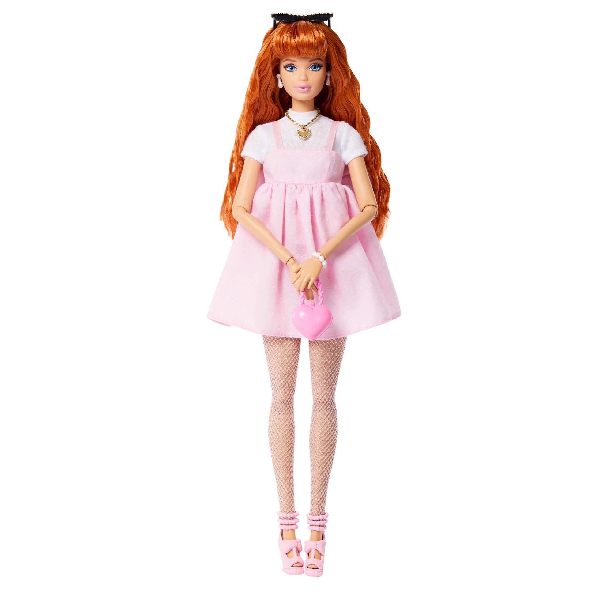 Midge channels Barbiecore in a pastel babydoll dress with an oversized bow in the back, layered over a white tee. Pink mesh tights add extra charm to her fab look! Bendable joints allow her to strike all sorts of poses!