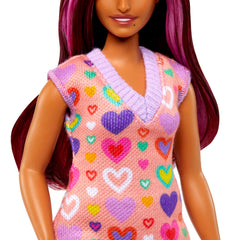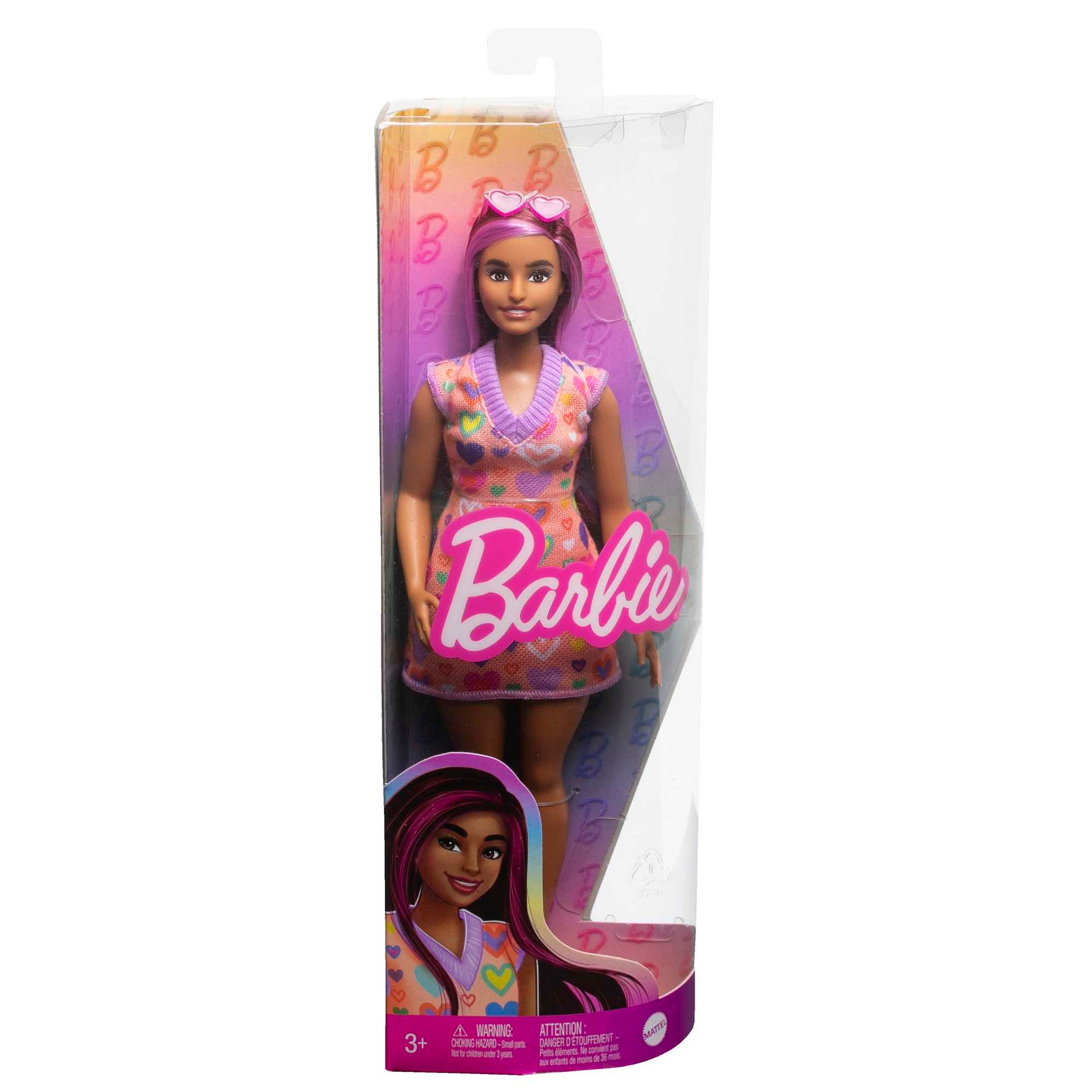 This Barbie® doll has a curvy body type and long, pink-streaked hair! Heart-shaped sunglasses and pastel platform shoes make her personality pop.