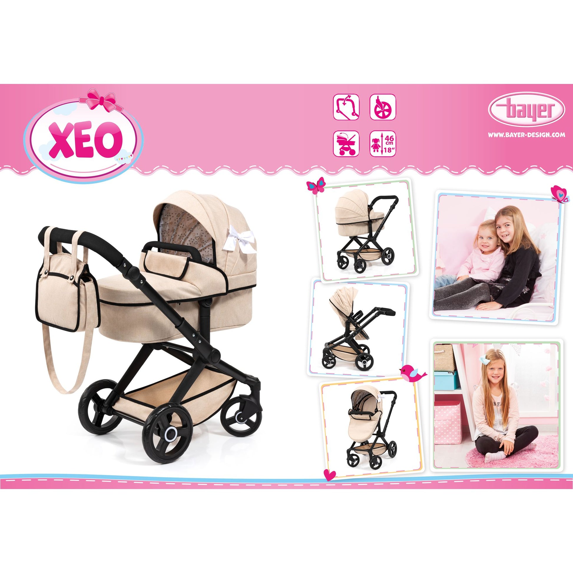 The combi doll’s pram XEO has a modern design and is suitable for dolls up to 52 cm. With its adjustable handle, this doll's pram is easily adaptable to your child's height; also, it's possible to mount the carrycot in direction of travel or towards your child. It’s also possible to change the angle of the carrycot, thus the doll's pram is convertible to a jogger pushchair with a few simple steps. The carrier’s cover will either way; if she's sitting or lying in the pram; protect the little doll from the sun and wind. The pivoted front wheels assure a stable cornering. For transportation reasons the doll's pram can easily be folded. The accompanying bag has a long handle to be used as a shoulder bag and two short ones as a hand bag.