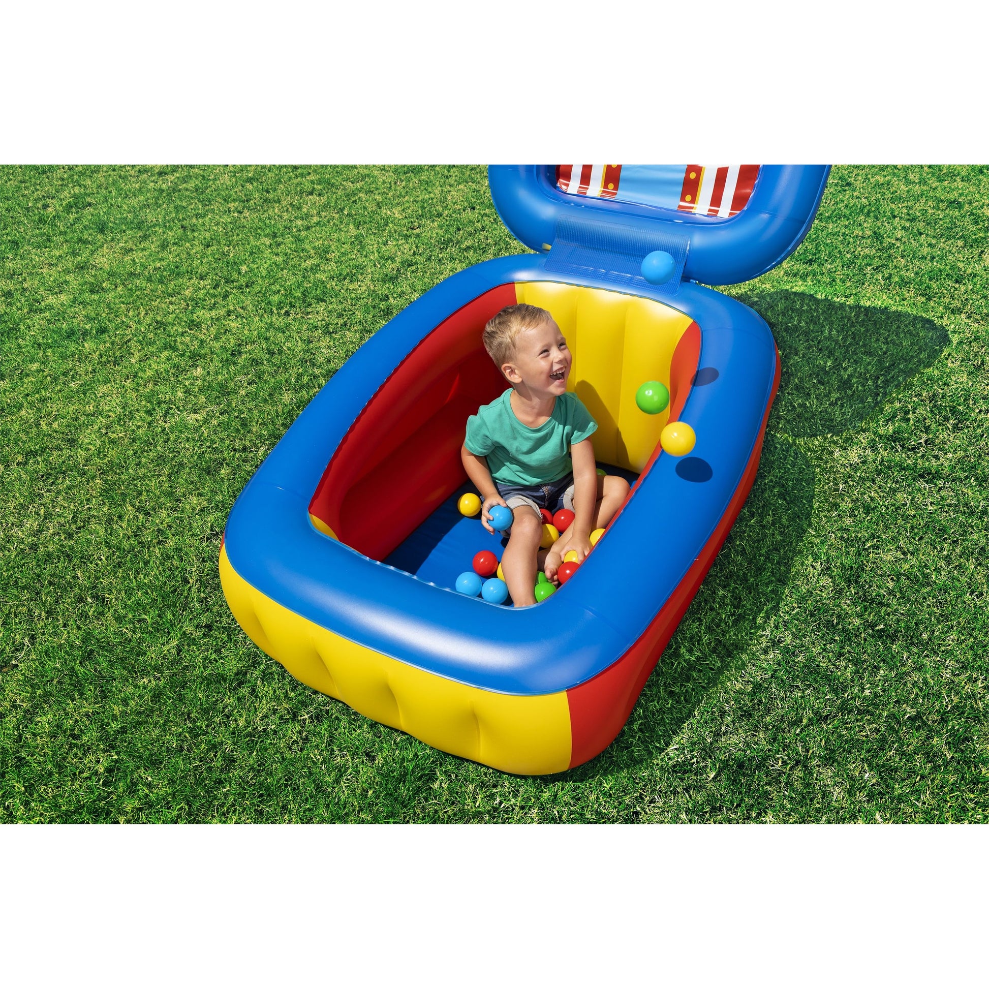 Grab a hotdog and some popcorn while you enjoy the Bestway® Flip'n Toss™ Multi-Use Ball Pit! The colourful design brings the fun of carnival inspired games right to your home all year long! With 25 multi-coloured play balls included, kids can shoot the balls at the open holes while the lid is closed or they can flip the lid for more ways to play. The included play balls can also be used for shooting at the hoop and open holes while the lid is open or the Flip 'n Toss can be used as a standard ball pit. The Flip 'n Toss Multi-Use Ball Pit is a wonderful toy for developmental play as it helps kids practice hand coordination and other fine motor skills. Plus, the convenient design means it is easy to inflate and deflate for quick setup and easy storage. Great for indoor or outdoor use, Bestway's Flip 'n Toss Multi-Use Ball Pit brings the magic of the county fair to your child’s life without leaving the house!
