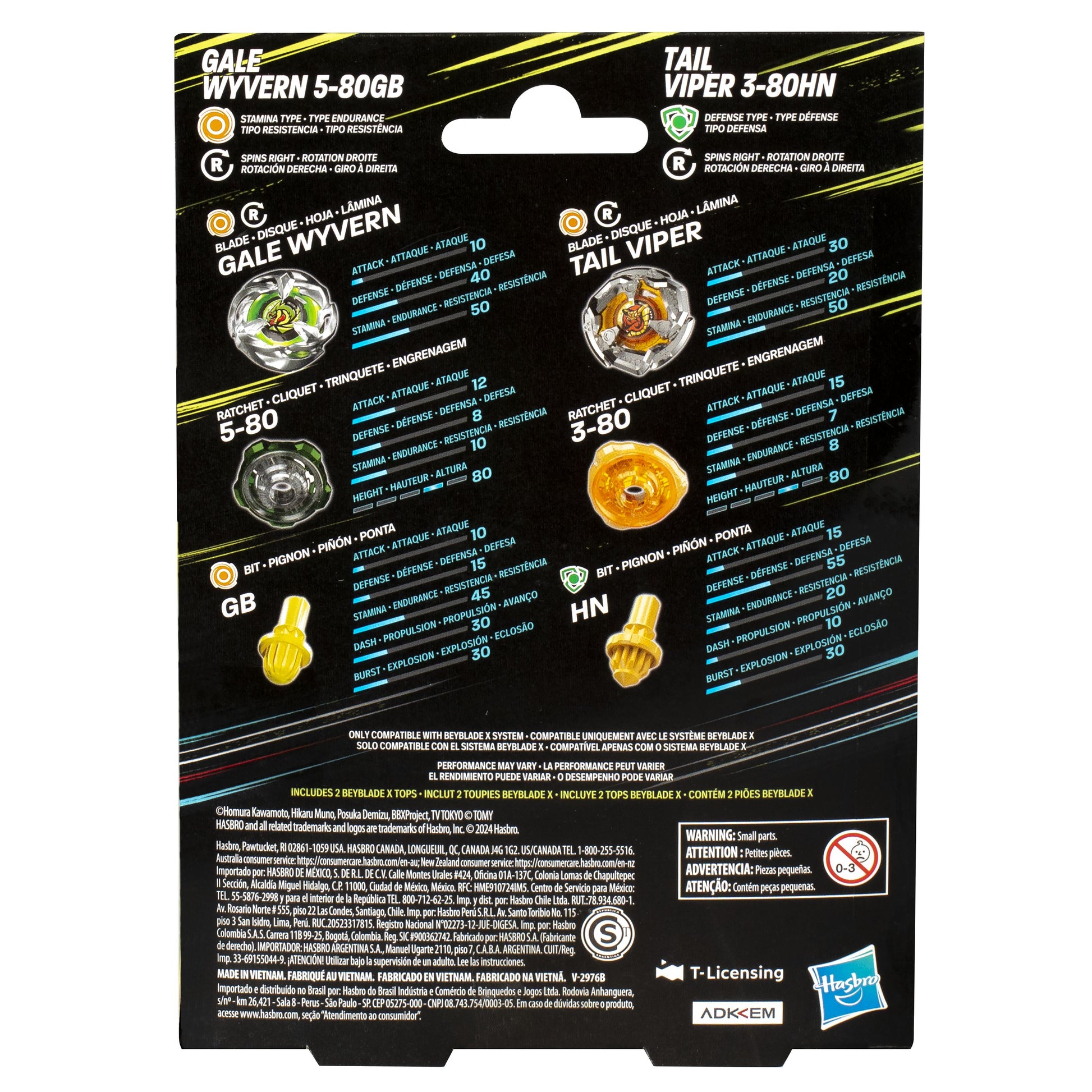 HARNESS THE POWER: Includes 2 Takara Tomy-designed Beyblade X tops with authentic die-cast metal parts: Gale Wyvern 5-80GB Right-Spin Stamina Type and Tail Viper 3-80HN Right-Spin Defense Type with a Stamina Type Blade