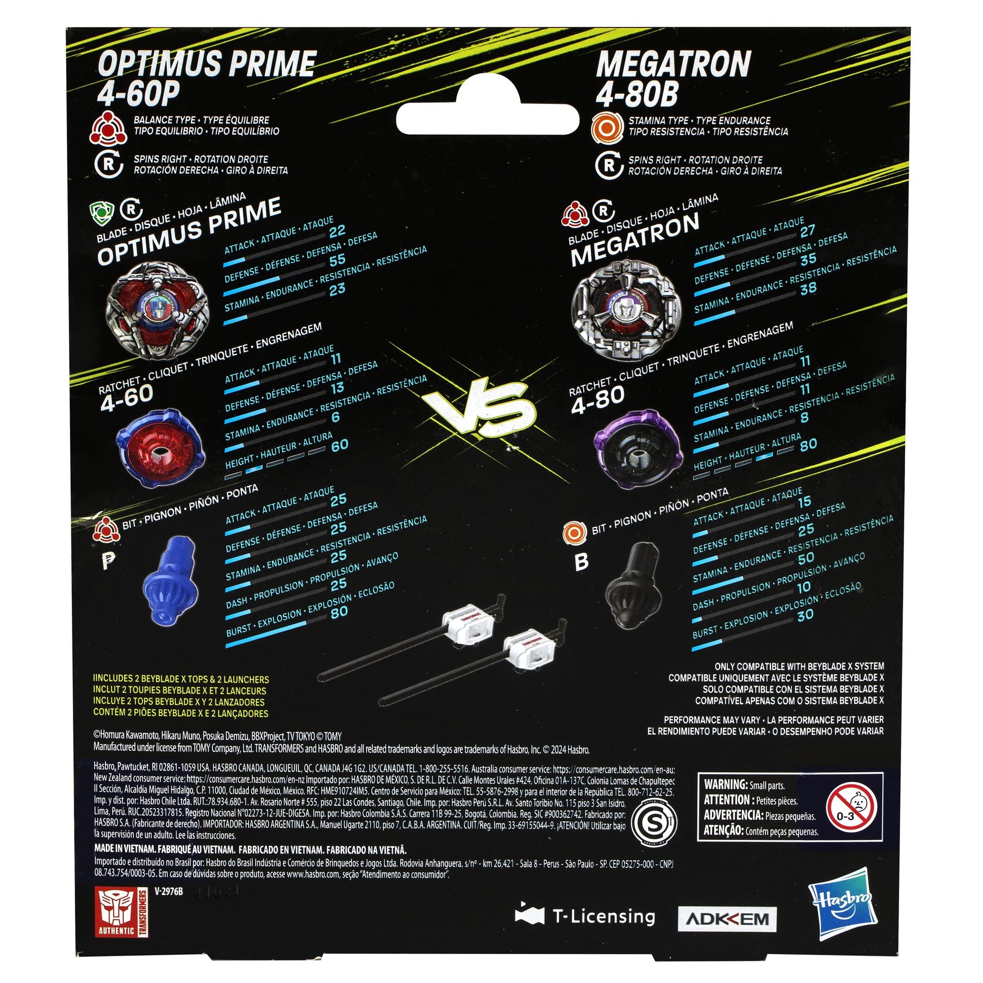 HARNESS THE POWER: Includes 2 Takara Tomy-designed Beyblade X tops with authentic die-cast metal parts: Optimus Prime 4-60P Right-Spin Balance Type with Defense Type blade and Megatron 4-80B Right-Spin Stamina Type with Balance Type Blade; and 2 launchers