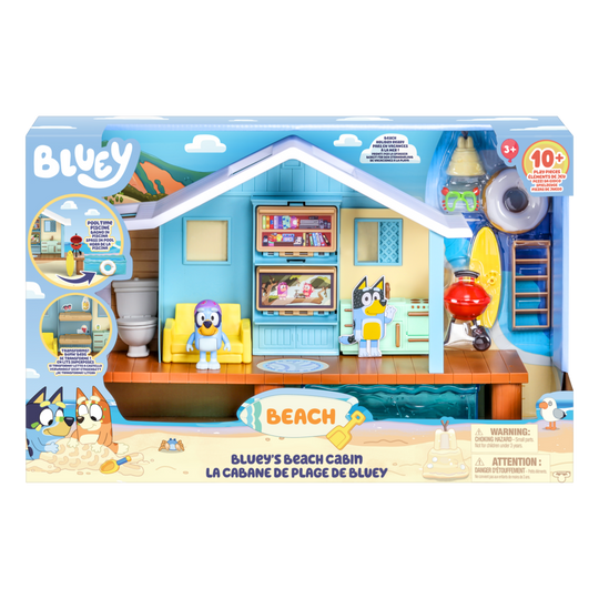 Now your kids can go on a beach holiday with Bluey when she visits her Beach Cabin! Bluey's Beach Cabin playset is loaded with fun features to make it a vacation to remember! Join Bluey and her family on some imaginary adventures as they spend a great day paddling in the waves and playing in the sand!
