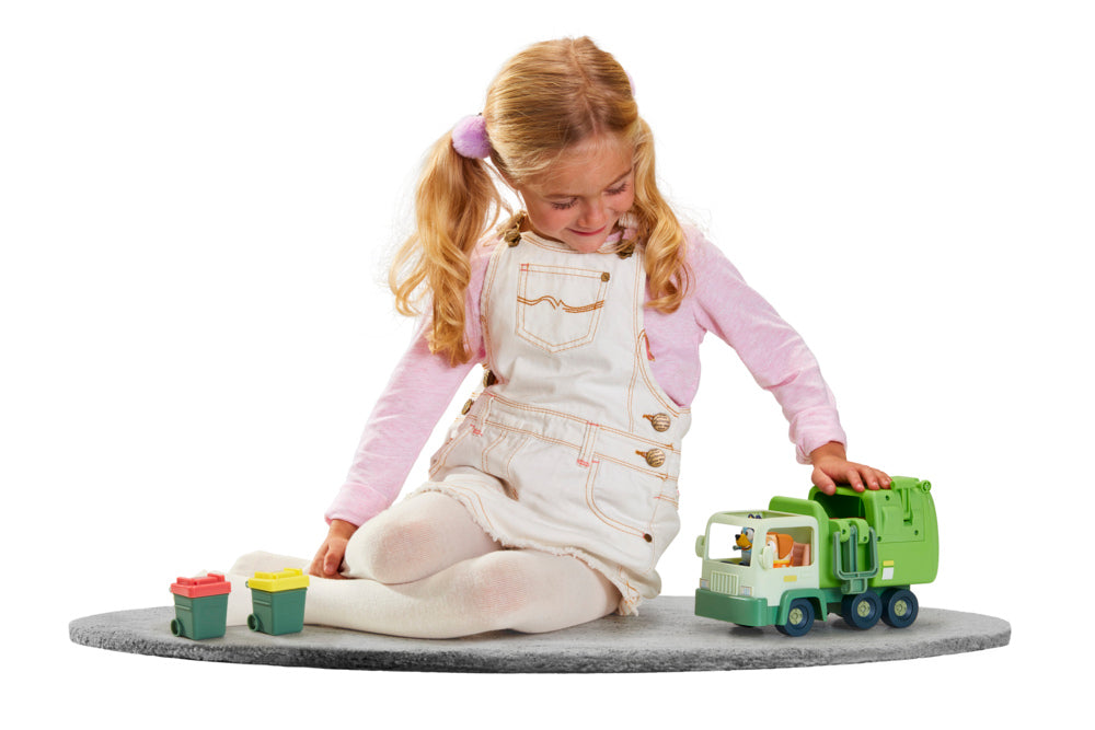 It's Bin Night at Bluey's place! Now you can help Bluey and the Bin Man collect the rubbish in his Garbage Truck. The Bluey Garbage Truck Playset comes with a 2.5" Figure of Bluey and the Bin Man. They are the perfect size to sit inside the Truck's cabin so they can ride along together. There are also 2 Rubbish Bins.