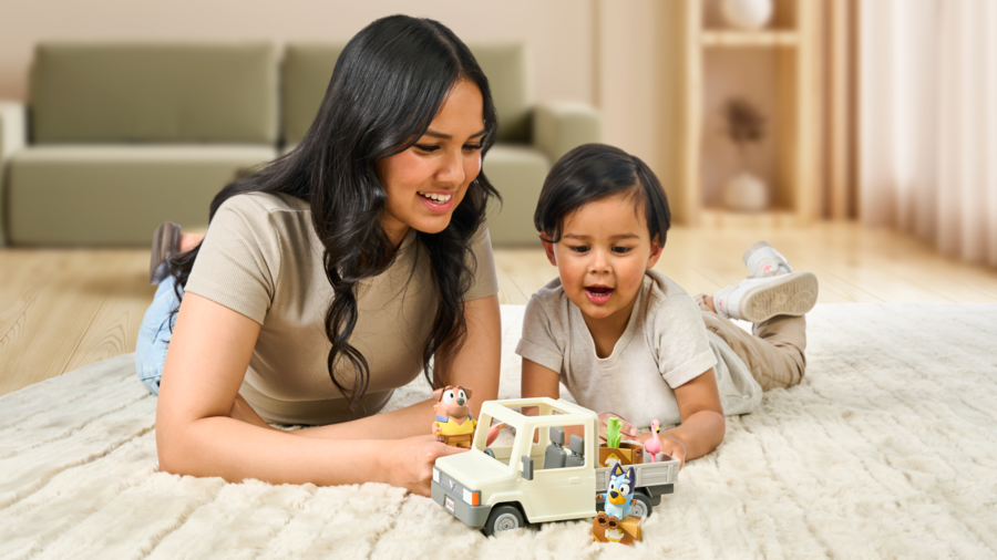 Bluey Tradies Ute. Get some work done with Bluey and Sparky in their Tradies Ute. Includes 7 Play Pieces and Sticker Sheet