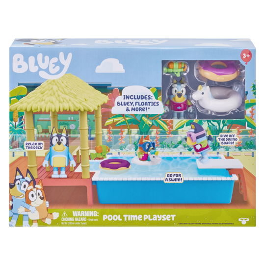 The Pool Time Playset allows you to bring the fun and imaginative play of Bluey into your home. Take a break from the sun and relax on the deck under the cabana. Dressed in her swim suit, Bluey is ready for some fun in the sun with all her pool toys and accessories. Dive Bluey off the diving board and go for a swim.