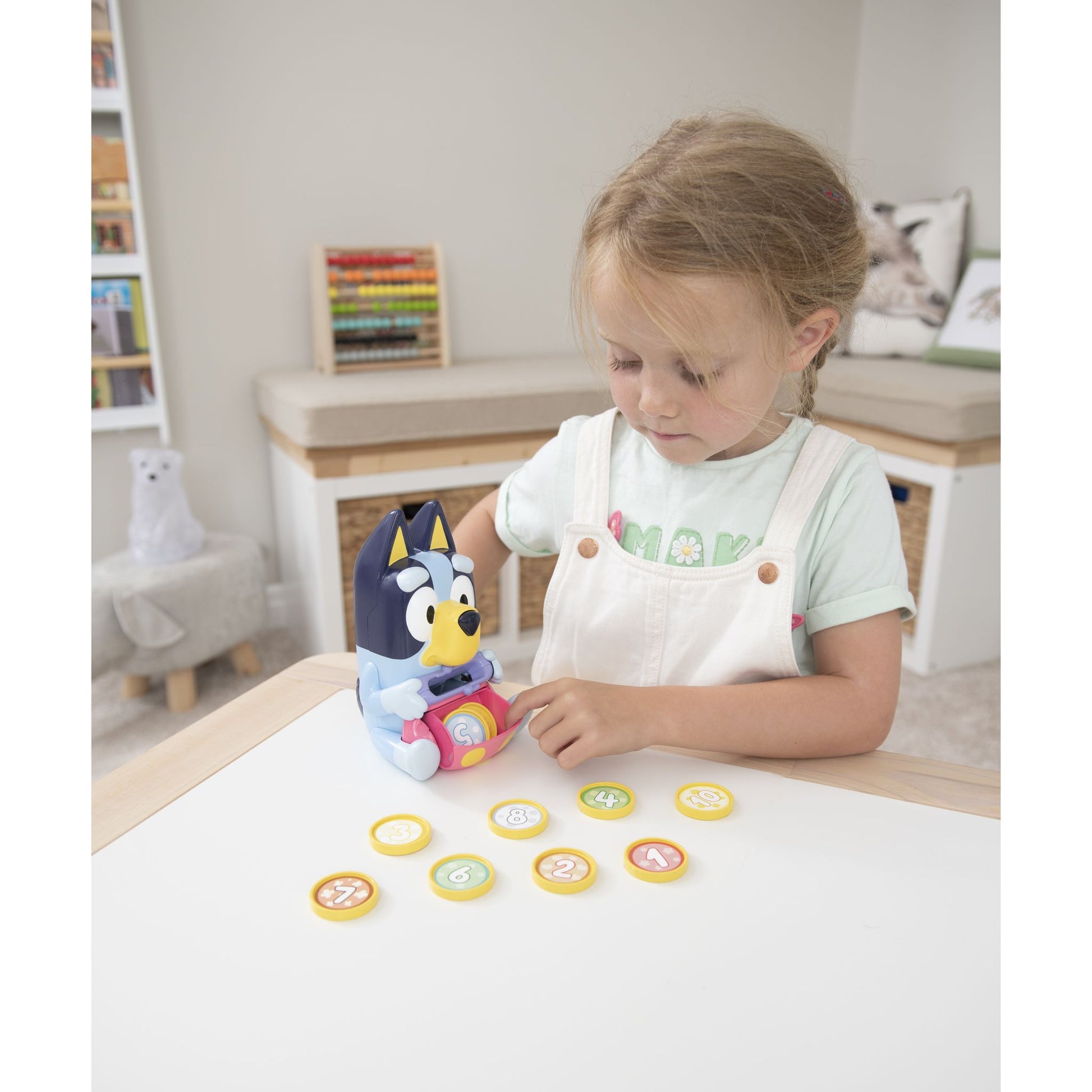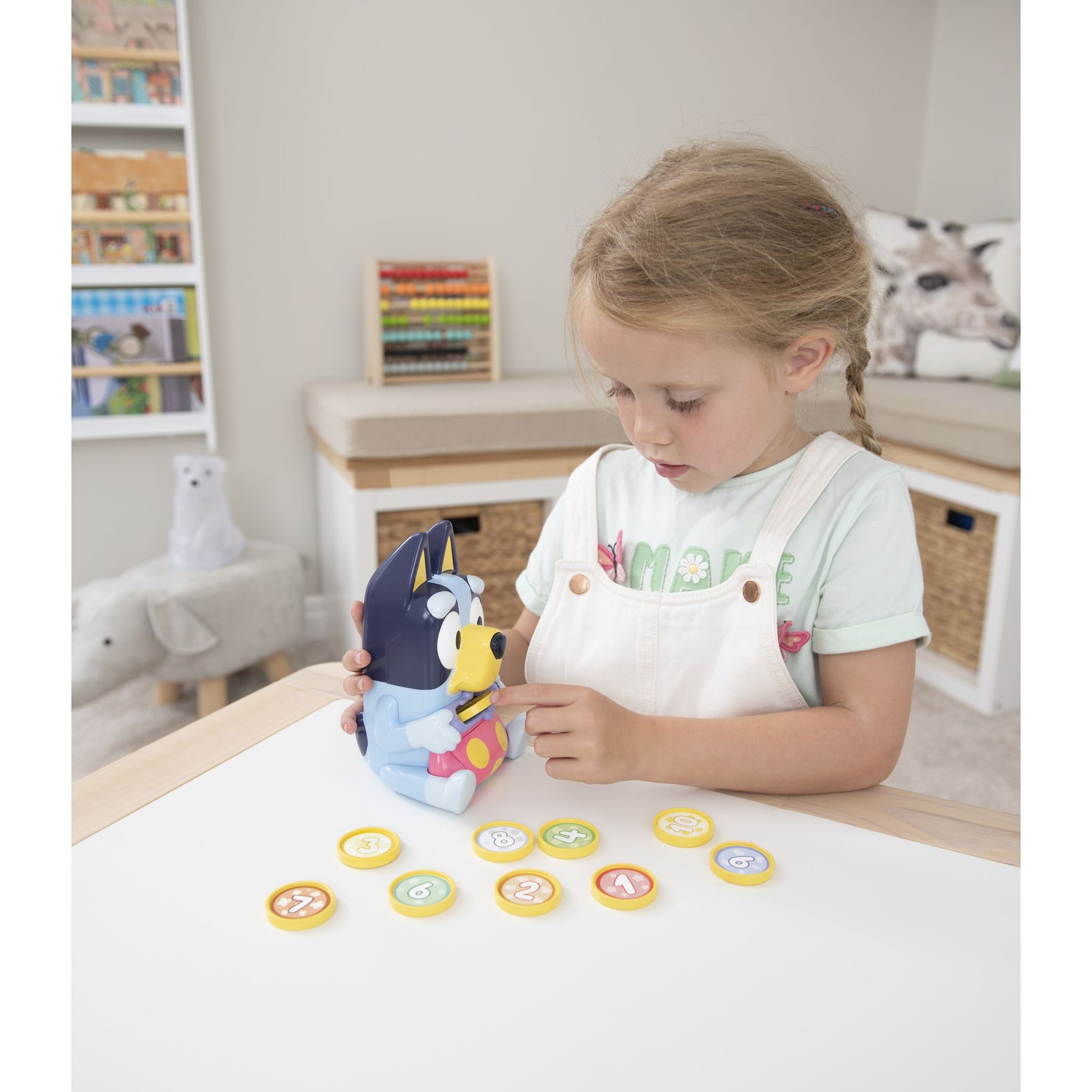 The Save with Bluey toy is shaped just like Bluey from the show and it includes 10 numbered coins. Insert coins to hear different sounds effects and character sounds. Simply open the purse to retrieve the coins and start all over again! Press Bluey's nose to hear the Bluey theme tune. Requires 2 x AA batteries (included). Suitable for ages 2 years+.