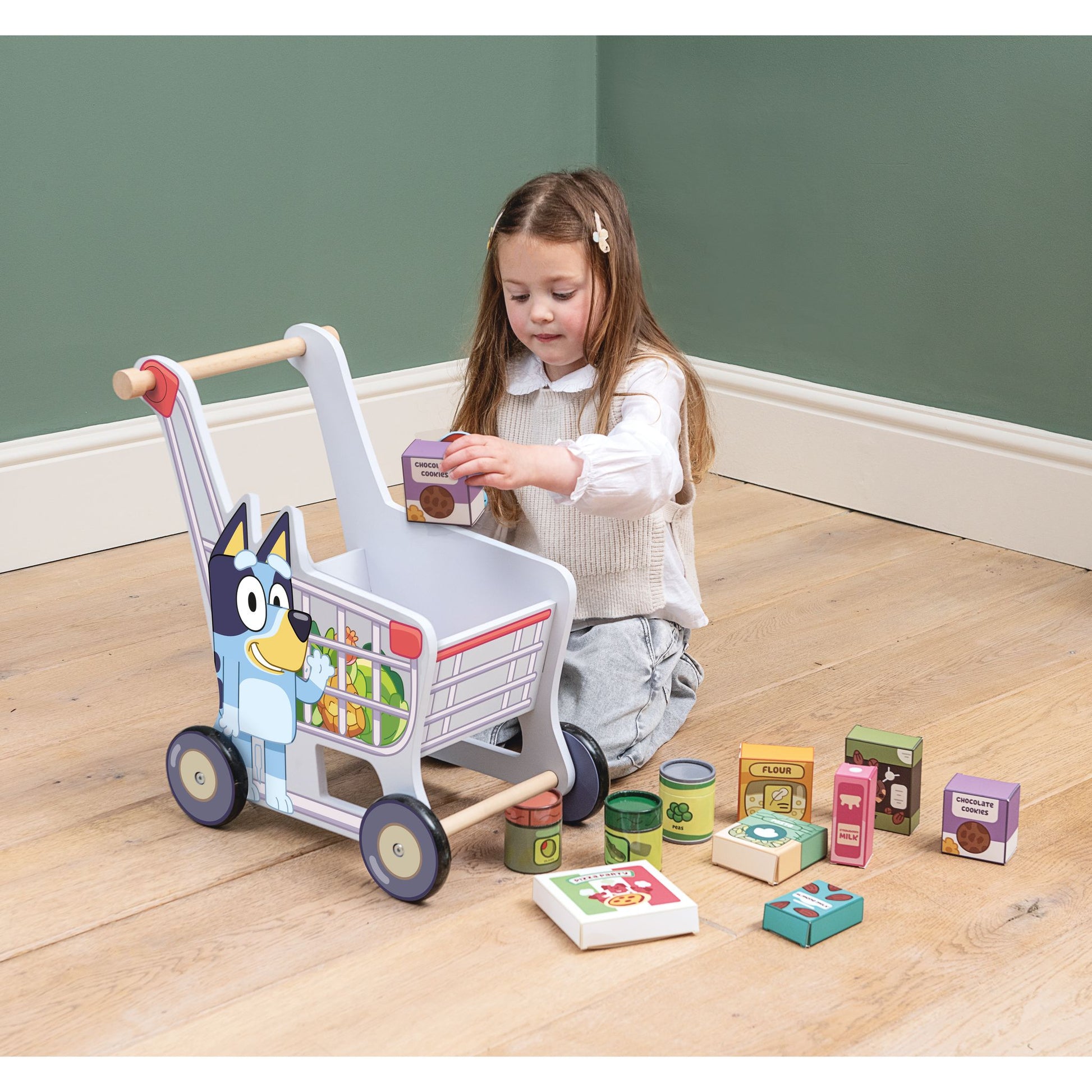 It’s time to hit the shops with Bluey and Bingo! You can push your trolley around collecting your groceries as you go. A great way to play with friends or independently. Perfect for roleplay fun, this trolley will help improve hand-eye coordination, imagination and helps develop social skills. Made with real wood, the trolley itself features character art of Bluey and Bingo on either side. Suitable for 18 months+.