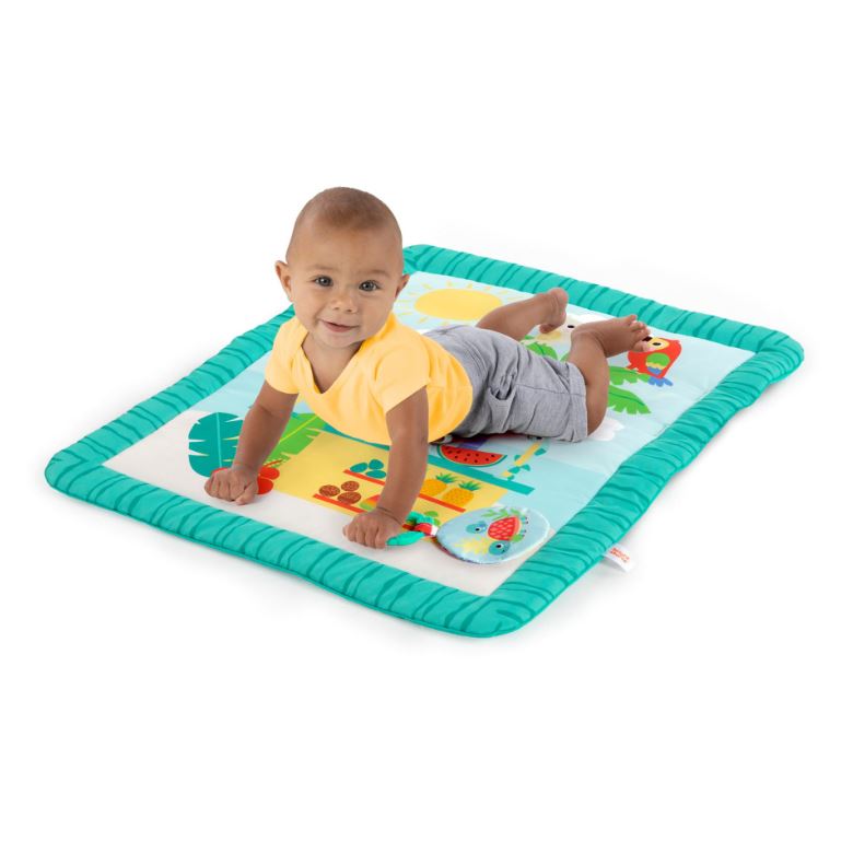Tummy time feels like a vacation with this totally tropical mat! The Tiki Toy Bar Activity Gym from Bright Starts is packed with playtime fun for different ages and stages. There are 3 ways to play: tummy time, lay & play or sit & play! The toy bar canopy dangles activity toys for baby to lay back and reach or sit and play as she develops. Practice fine motor skills with the bead chaser toy, touch and squeeze the crinkle medallion, and explore every detail of the textured leaf toy. When playtime is over, this compact mat is easy to fold and store. It’s a forecast of sunny skies and smiles with this tiki mat!