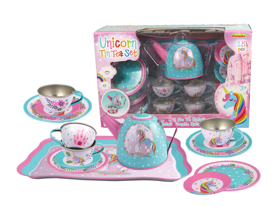 Kids can enjoy a lovely little tea party with you and their toys using this all in one metal tea set with unicorn design.