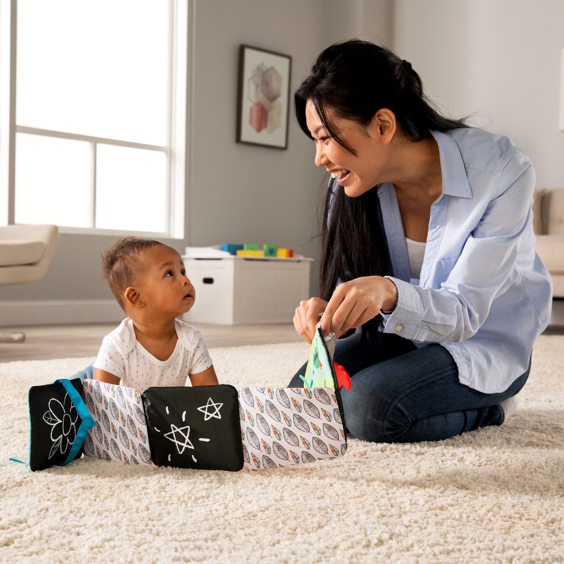 Grow with Baby Toy: Black and white contrast pages are perfect for younger babies, while the reverse side bursts with bright colours