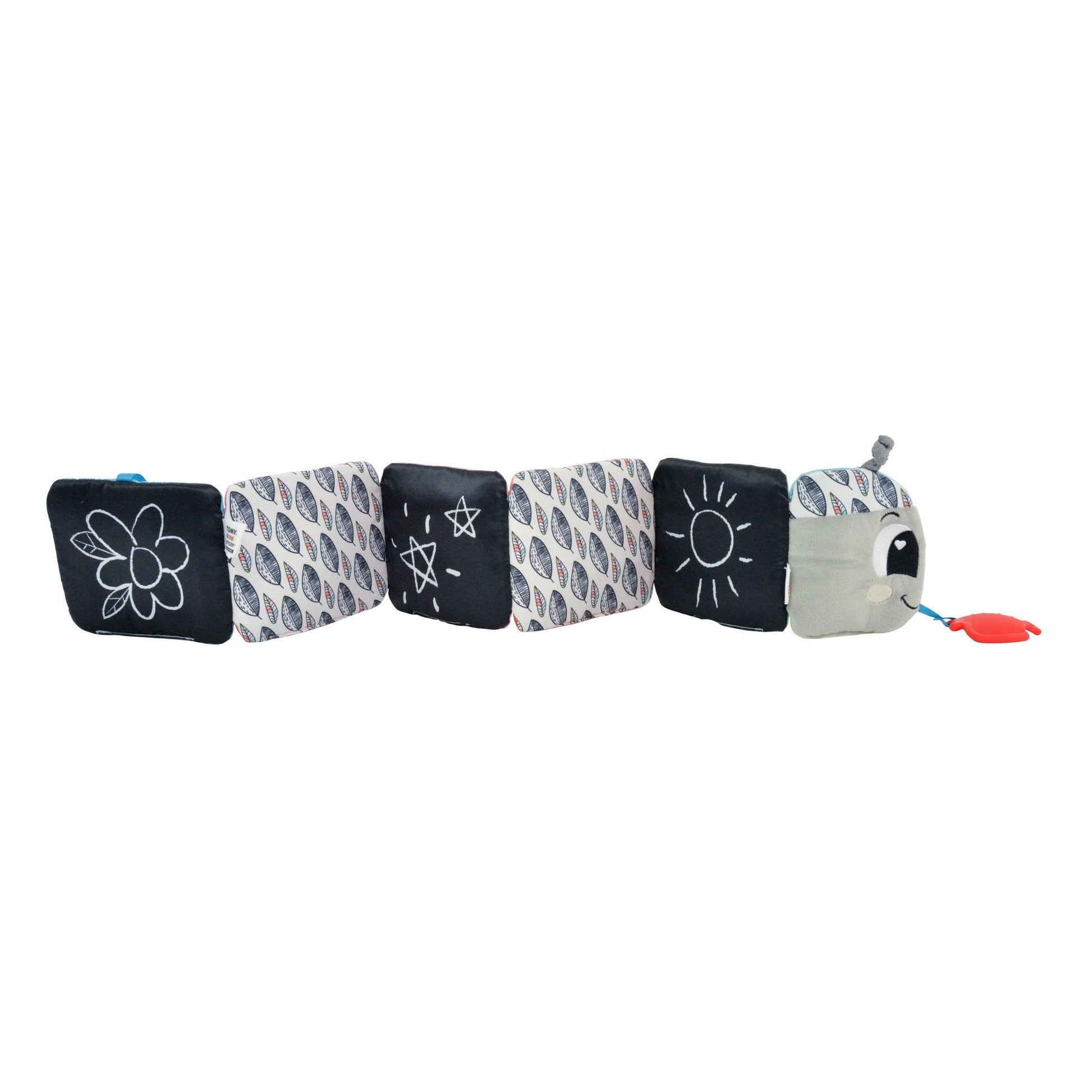 Embark on a sensory adventure with this adorable Lamaze Colourful Caterpillar Journey soft book! This baby toy will keep your little one entertained and happy as you read together and enjoy precious bonding time. On one side, each accordion panel is bursting with bright colours, playful images, and exciting things to explore – like a hidden squeaker, unique fabric textures, and delightful crinkle sounds. Flip to the other side to find calming, black-and-white patterns that delight younger babies. There’s even an apple tethered to the front that is perfect for chewing. This baby book folds up so that it is easy for the family to take along on the go. The Lamaze Colourful Journey Caterpillar book makes a sweet addition to a gift for a baby shower party or a fun gift for baby’s first birthday. Give them the gift of learning and early discovery!