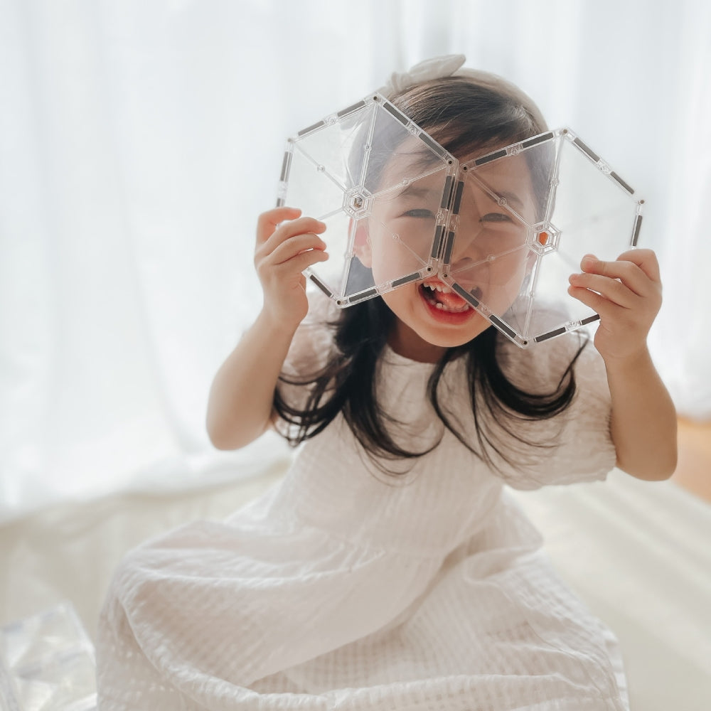 Unlock imagination and limitless play possibilities with the CONNETIX 34 Piece Clear Pack! With a variety of dazzlingly transparent magnetic tiles (including large hexagons!), this pack brings new dimensions and clarity to CONNETIX play. Creativity and imaginations will soar as children build unlimited inspired creations from Frozen castles, sparkling snowflakes and icy igloos to functional windows, glistening glasshouses and crystal globes.