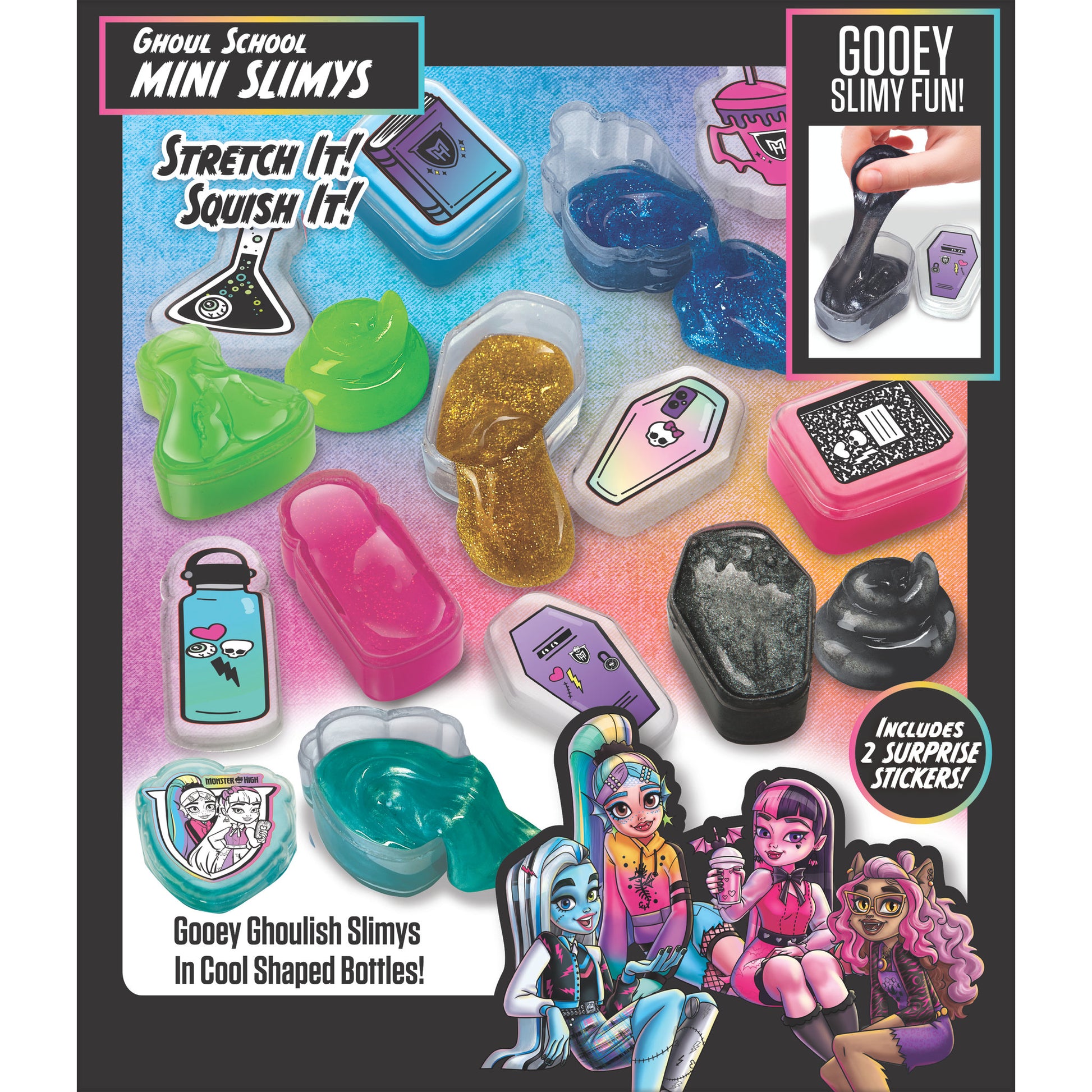 Get ready for ghoulish gooey fun with these Slimy collectible mini containers. Each set includes super stretchy premade slime hidden inside fun mini tubs.