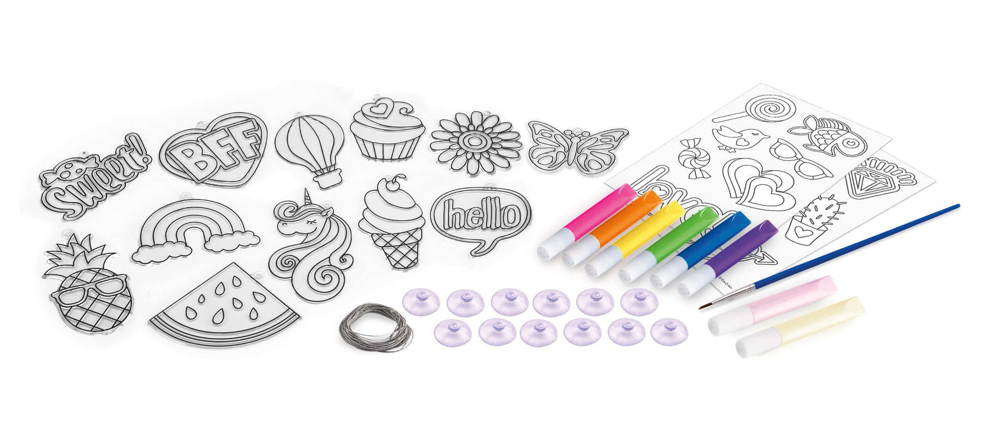 Includes:12 Plastic Suncatcher Designs, 12 Suction Caps, 1 Skein Silver Cord, 2 Design Templates 2 Tracing Sheets, 2 Colour-changing Window Paints (approx. 10ml each) 6 Window Paints (approx. 10 ml each) 1 Paint Brush, Instructions.