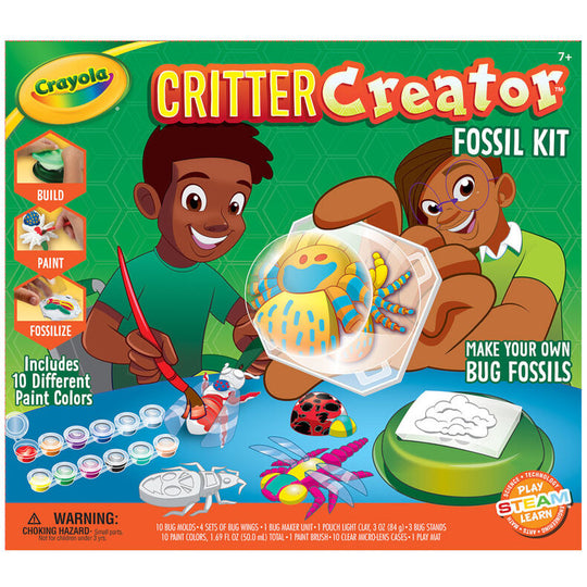 Bug-loving kids will have hours of fun with our Crayola Critter Creator Fossil Kit. With this cool craft kit for kids, they can build, paint, and fossilize more than 10 different types of bugs. Simply use the light modeling clay and bug molds to create super-detailed dragonflies, spiders, hornets, lady bugs, and more. Once the bug is formed, kids can paint the clay creation, using washable paint in classic or metallic colors.