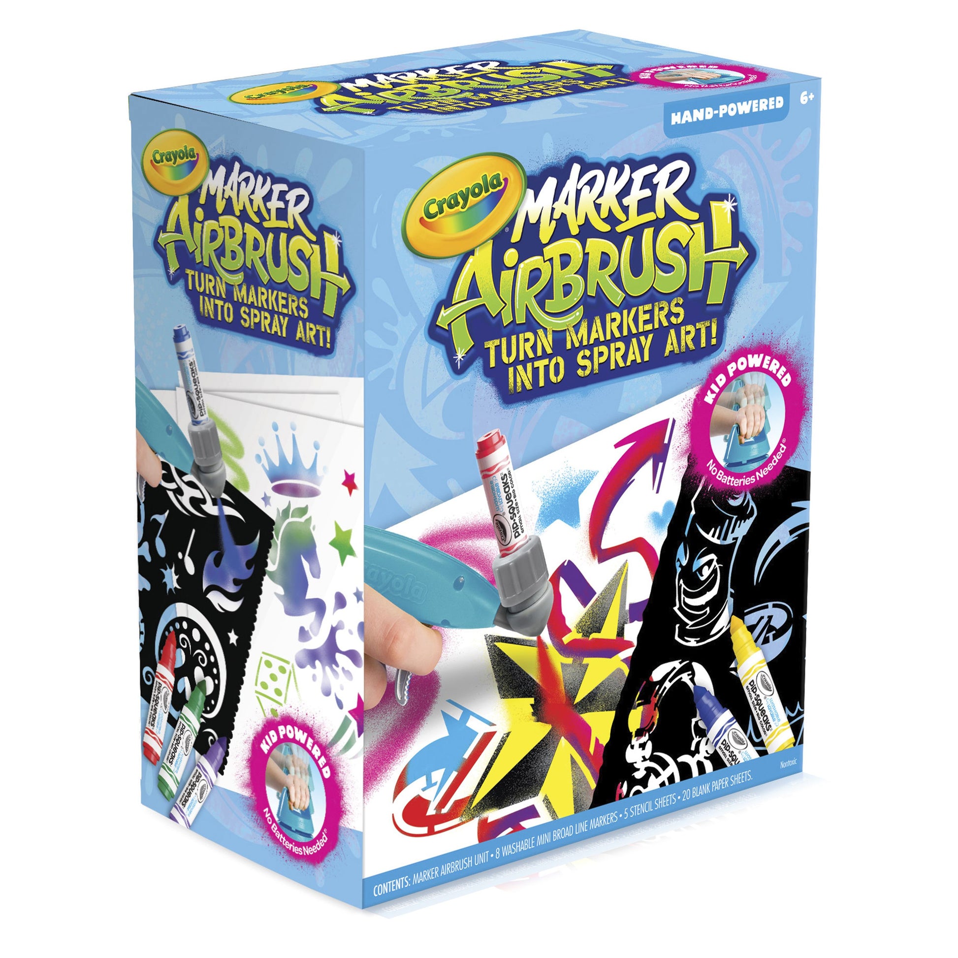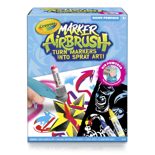 The new kit has a fresh new unit colour, stencils with aged up graphics, and more markers, stencils and paper sheets than previous versions. The hand pressurised airbrush machine uses Crayola's Broadline and Pip-Squeaks Markers to create a fine mist that's great for all kinds of art projects. The hand powered pump is easy to use - Simply load the marker, pump and spray!