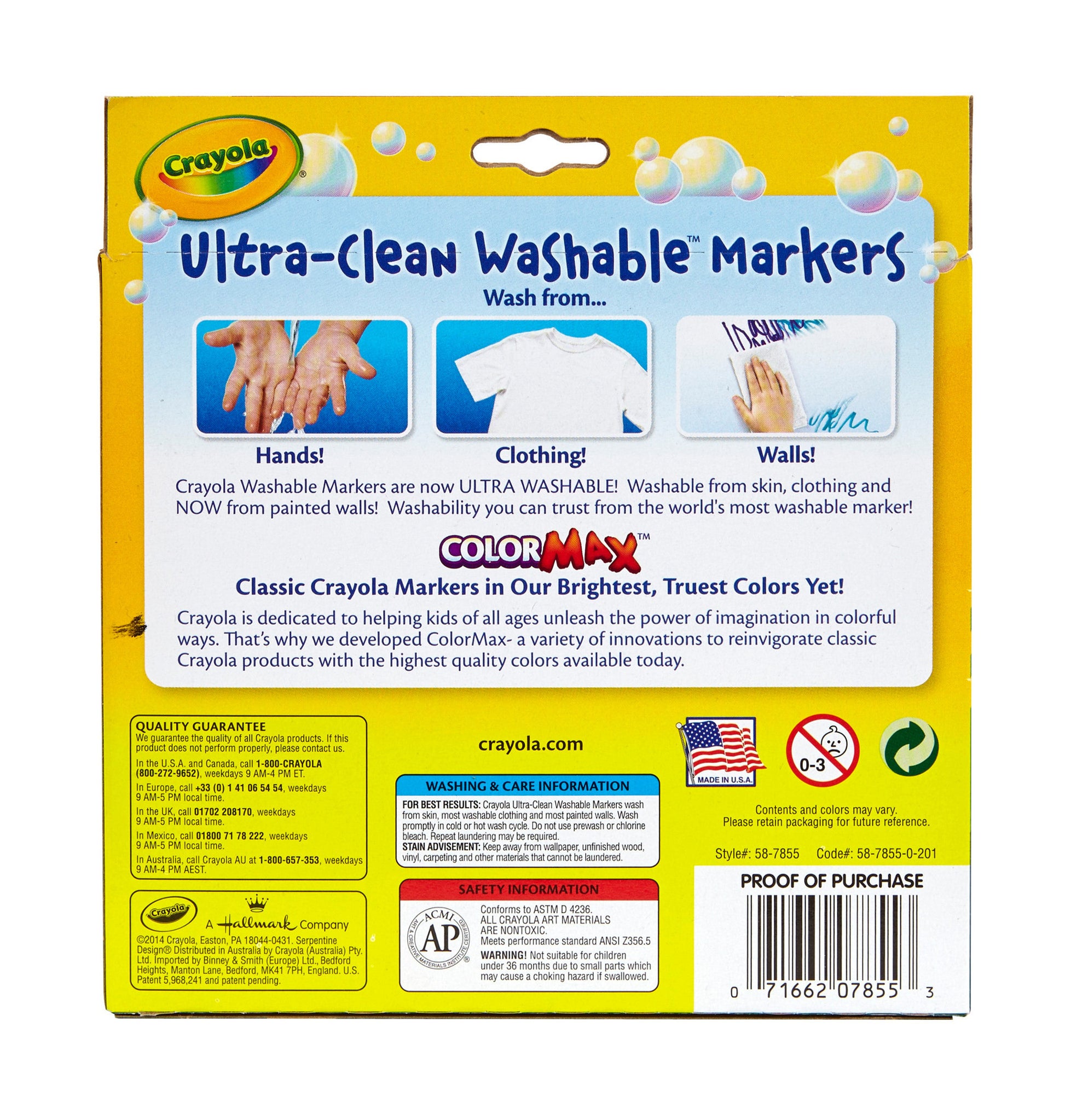 Ultra- Clean Washable Markers are specially formulated with ColorMax technology to have the brightest, vivid colors and overall great quality you expect from Crayola. .The Markers feature a versatile tip that allows you to draw thick or thin lines. When compared with other markers, Crayola are longer lasting and won't dry out as the tip can be rejuvenated by dipping in room temperature water. Crayola's Ultra-Clean washable ink is specially formulated to wash off machine washable clothing, walls, carpet and furniture.