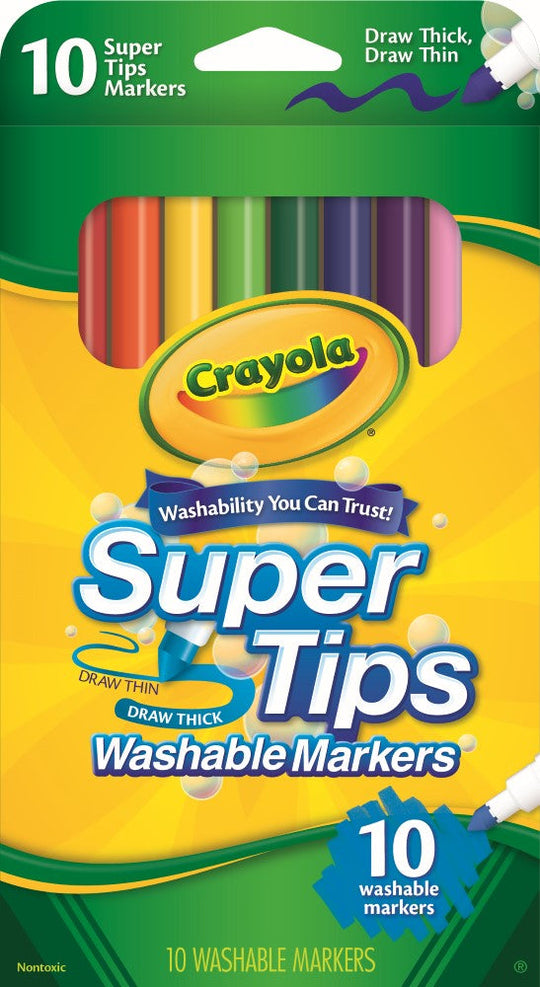 Super Tips are great for school projects, doodling and all-round colouring fun! The durable conical tip allows for thin lines from the point and thicker lines when held at an angle. 10 colours in the pack - Red, Orange, Yellow, Grass Green, Green, Blue, Violet, Carnation, Bronw, Black. Suitable for ages 3 years and up.