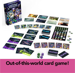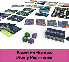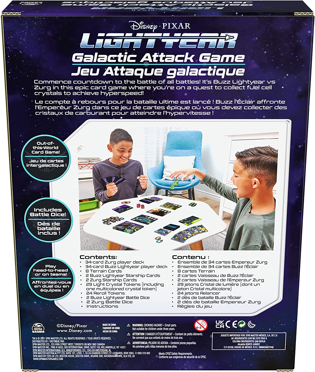 The Galactic Attack card dice game can be played head-to-head or in teams of two. In this out-of-this-world card game, get ready to fuel your ship, duel your enemy, and save the galaxy. Commence countdown to the battle of all battles! It’s Buzz Lightyear vs Zurg in this epic card game where you’re on a quest to collect fuel cell crystals to achieve hyperspeed.