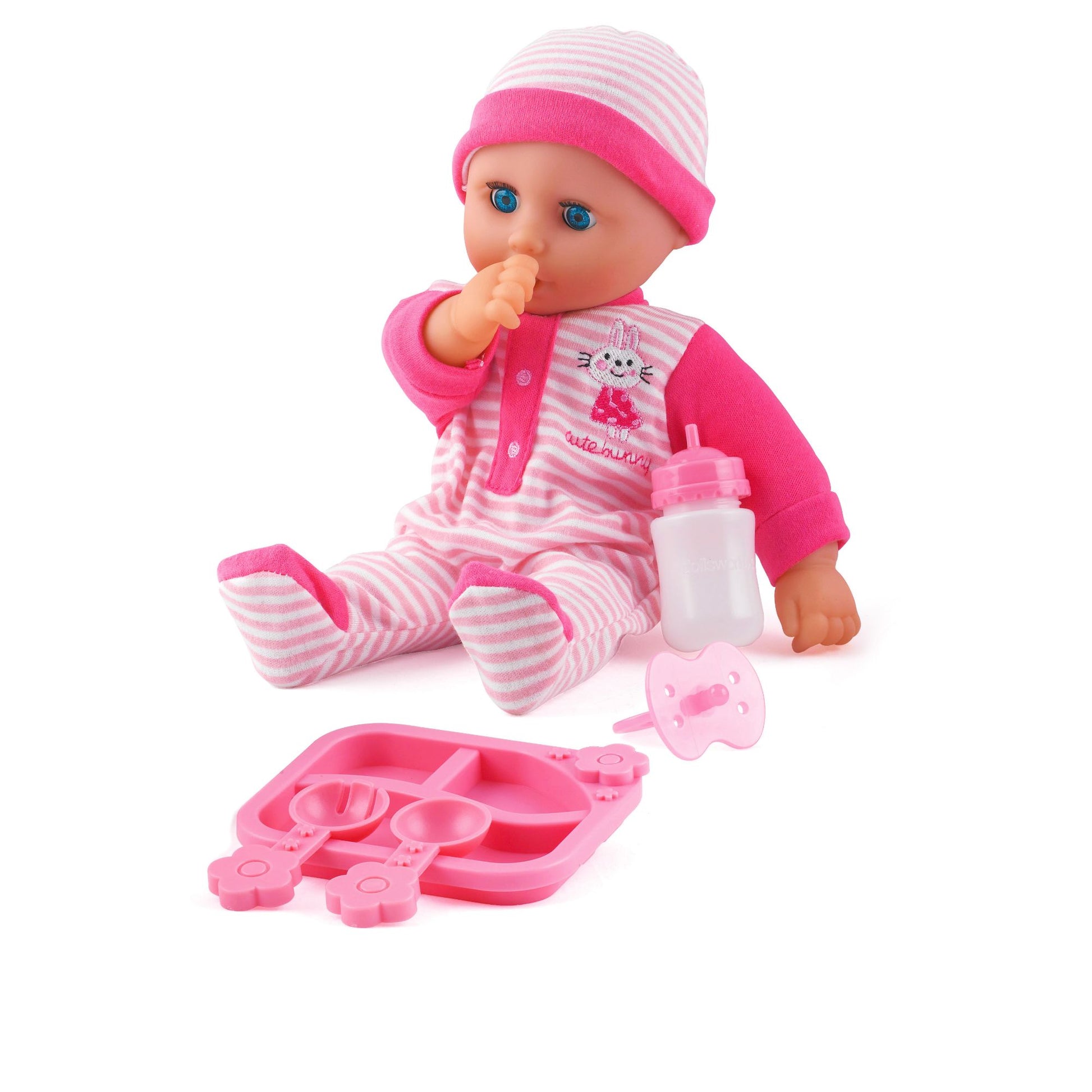 30cm Soft Bodied doll which by pressing its tummy makes 16 real baby sounds. Sleeping eyes, deluxe outfit & 3 piece feeding set with bottle & dummy.