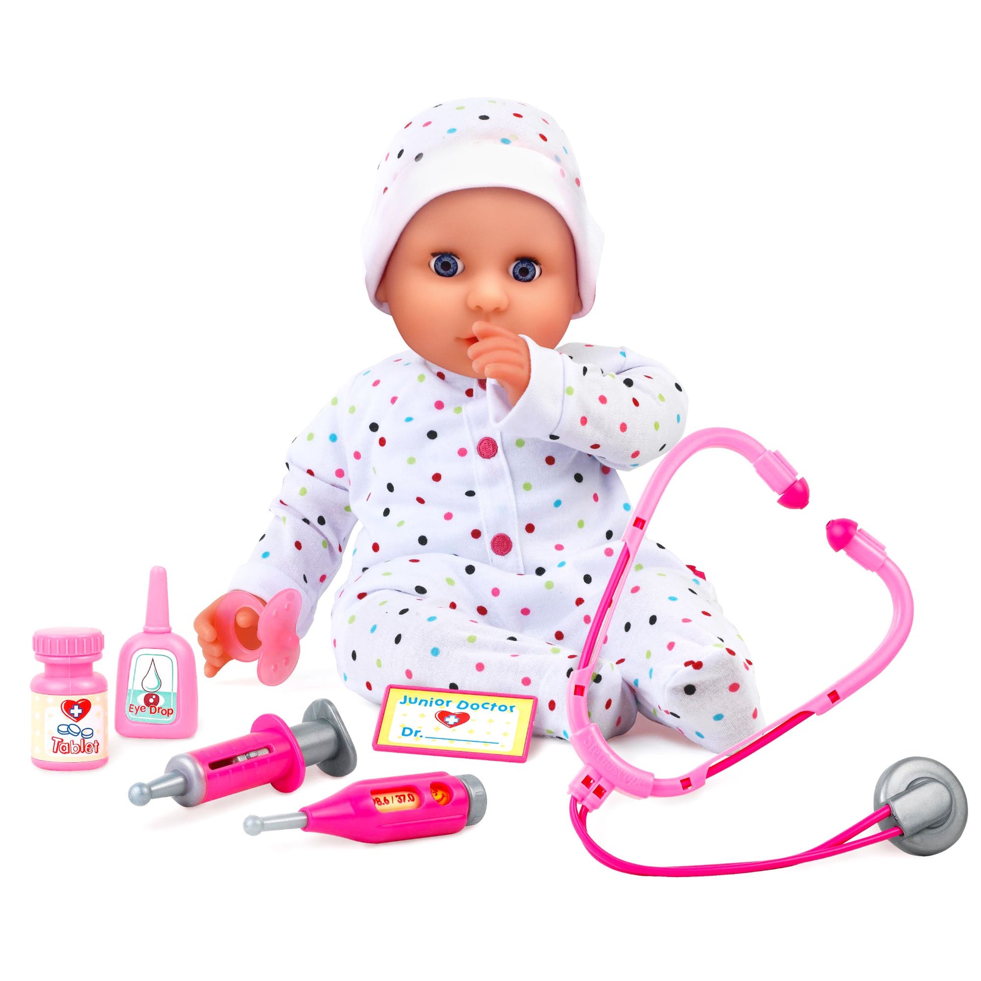 46cm deluxe soft bodied doll with sleeping eyes, includes dummy and 6 piece doctors set.