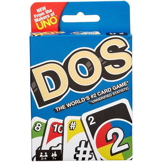 UNO™ has a new best friend, DOS™! In this fun card game, two is more important than one, and number matching is king! Just like UNO™, DOS™ involves a race to be the first to get rid of your cards. To start, there are two discard piles between the players. On each player's turn they can discard on either pile with either one or two cards, so if a player has two cards that add up to the number of a card in the center pile, they are able to put down BOTH cards. When you're down to two cards, don't forget to yell "DOS!" The first person to 200 points is the winner! The game includes a 112-card deck plus instructions. For 2 to 4 players. Ages 7 and older. Colors and decorations may vary. This exciting card game invites two to four players to challenge each other as individuals or as teams. The goal is to be the first to get rid of all your cards, and special WILD cards change the gameplay. Matching numbers is most important, but get BONUS points for matching colors as you race toward a score of 200. If you go out first, you earn points for cards left in your opponents' hands! When there are two cards to go, don't forget to yell "DOS!" 7+