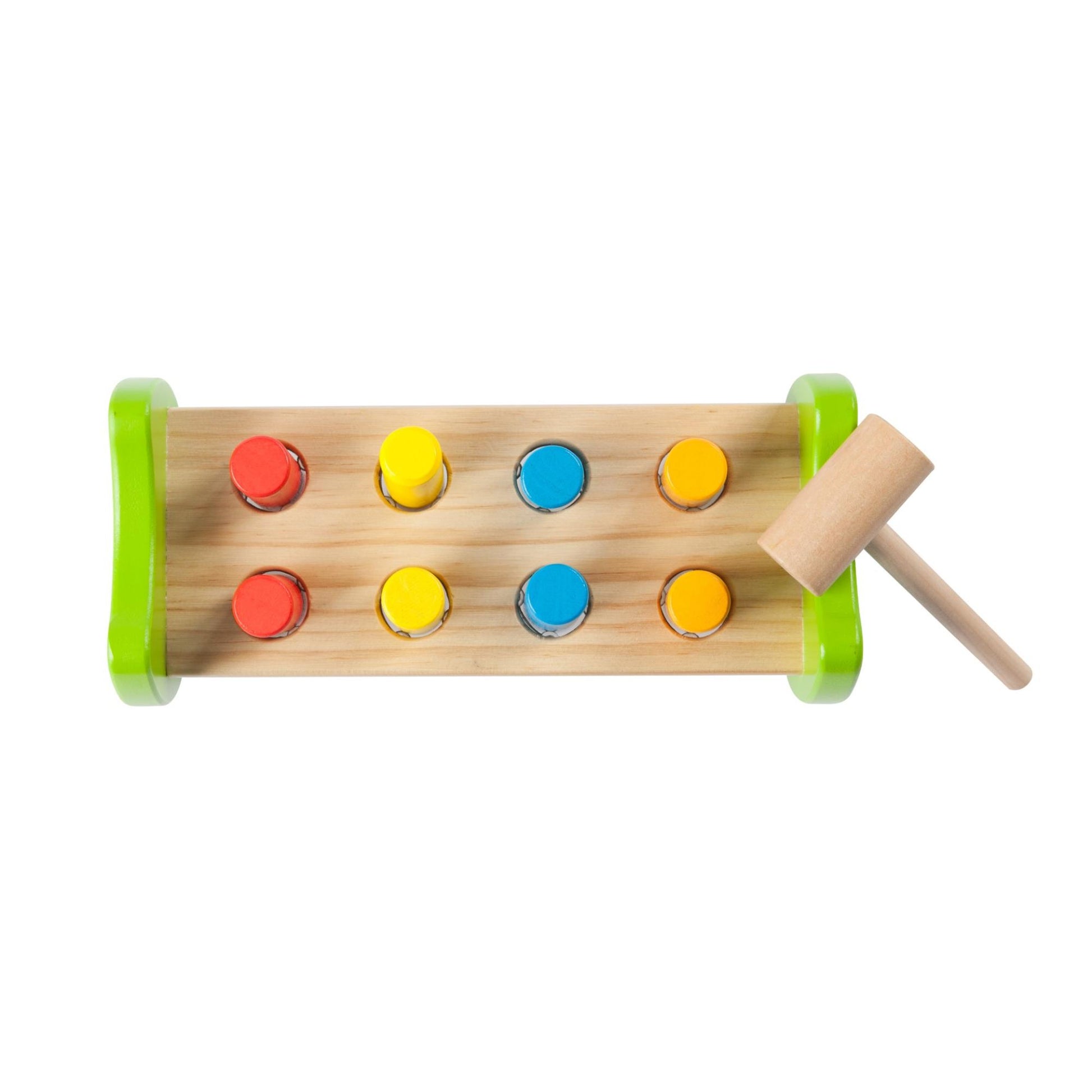 Baby's first workbench!Endless delight, fascination, and satisfaction ensue when little ones grab ahold of the wooden mallet and start hammering away at the eight colorful pegs.With each pound, the pegs move further through the wooden bench, just like a real-life nail!Get a head start on hand-eye coordination with the Pound & Tap Hammer Bench