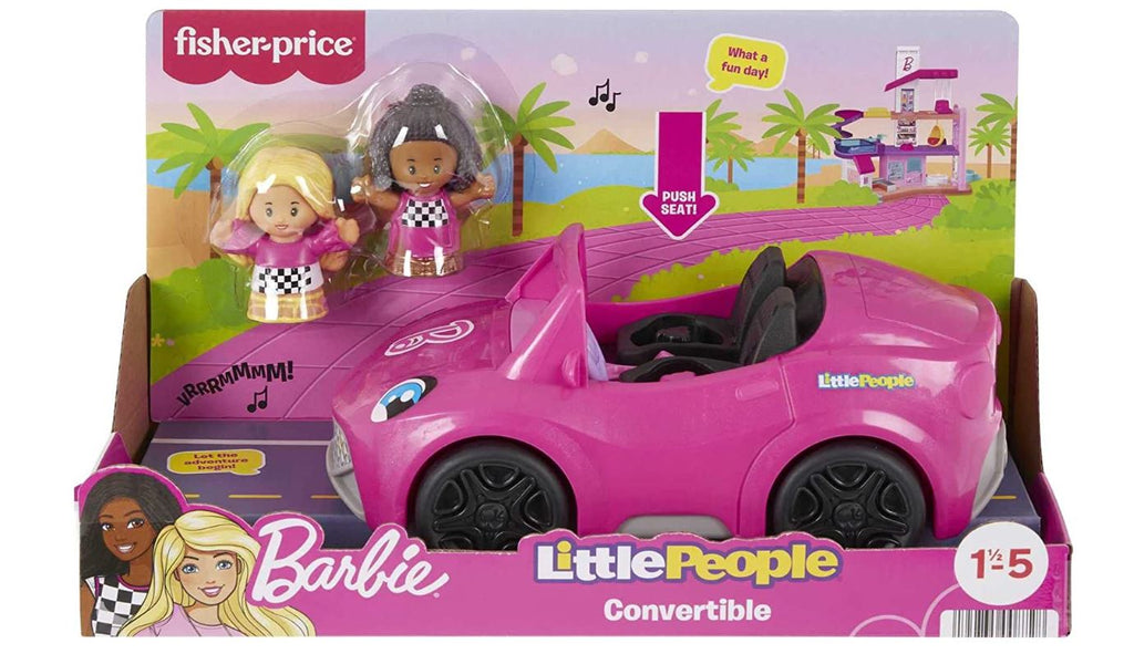 The classic Barbie® convertible is brought down to Little People® toy size for toddler-friendly pretend play with this adorable vehicle and figure set from Fisher-Price®. When kids press one of the Little People® figures into the car's driver's seat, they'll hear fun songs, sounds and phrases. Sized just right for little hands, this push-along toy convertible seats both figures and features cool Barbie® colors and graphics.