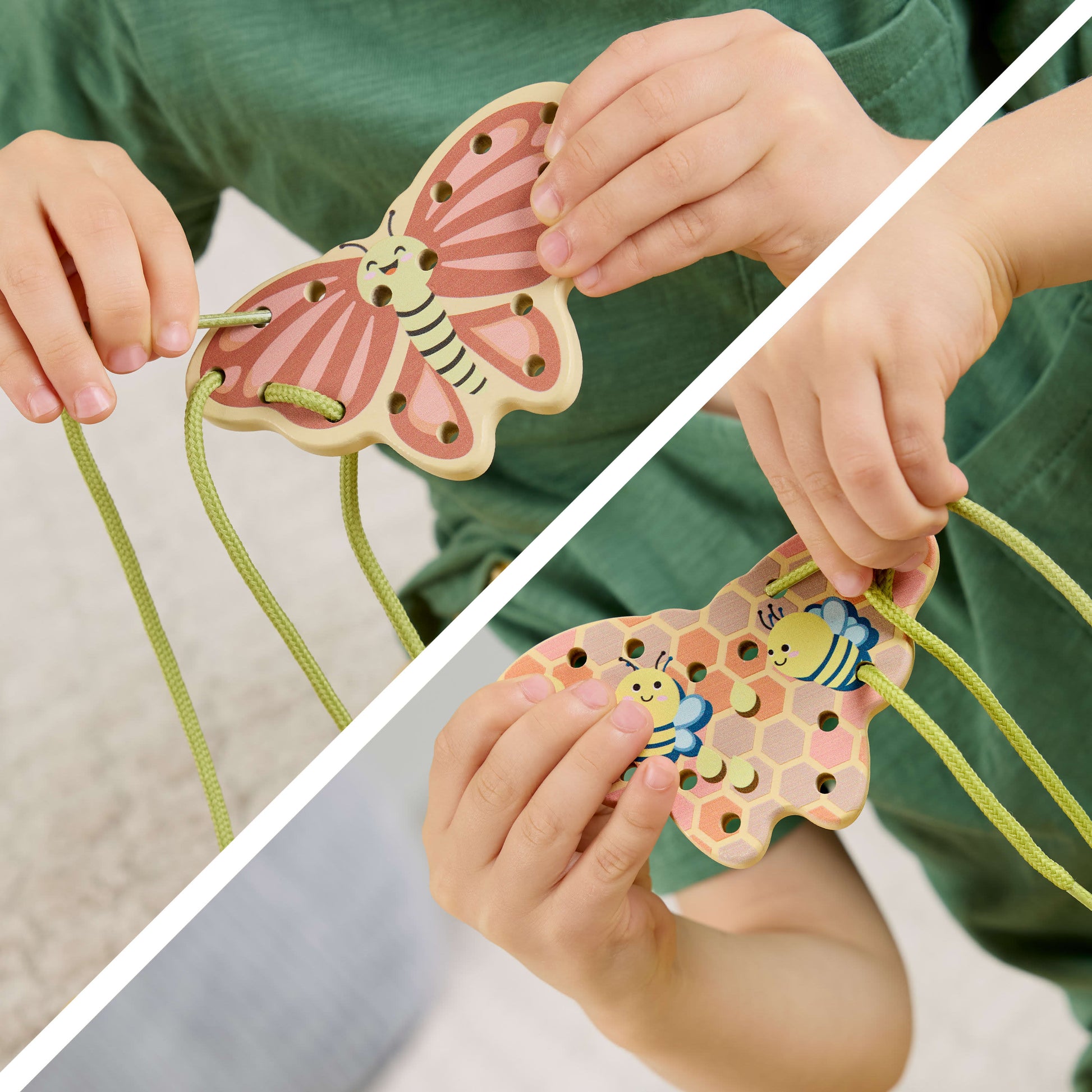 Made with wood from Forest Stewardship Council-certified sources (FSC-N004566) and decorated with non-toxic, water-based paint, this garden-themed lacing activity set encourages creativity while strengthening dexterity and hand-eye coordination. Colours and decorations may vary.