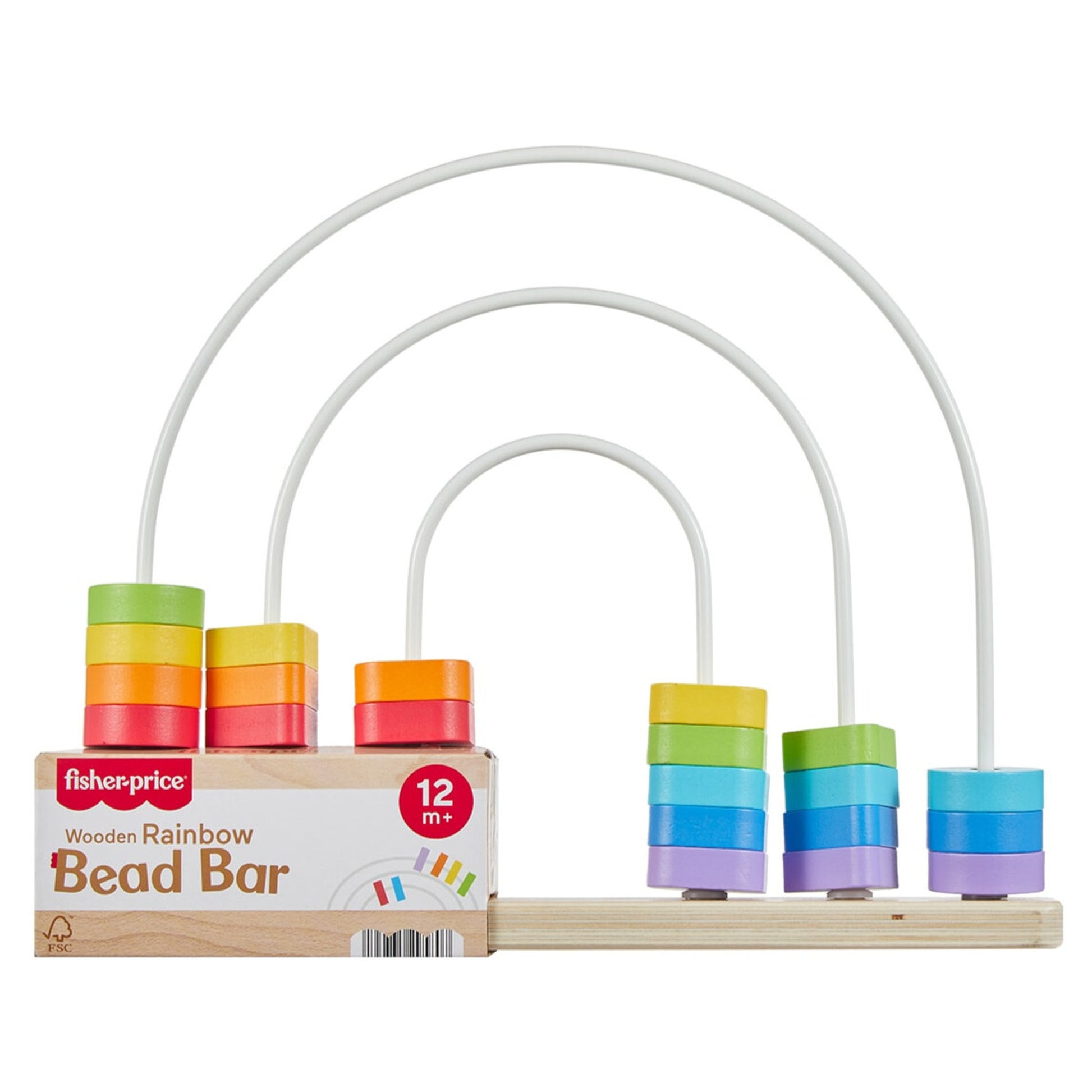 The Fisher Price Wooden Rainbow Bead Bar helps toddlers discover colours, shapes and early counting through hands on bead play. Featuring 21 bright beads in three fun shapes, kids can slide and move them across the bars while building fine motor skills and hand eye coordination. Made from FSC certified wood and finished with non toxic, water based paint.