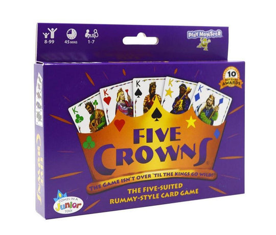 Five Crowns is rummy with a five-suited deck and a twist. The set collection aspect of rummy is basically the same, with groups of three cards in either runs or denominations making a valid meld. The twist is that in each hand the number of cards required to create a meld increases, from three cards in the first hand to thirteen in the last. The game, therefore, consists of eleven hands.