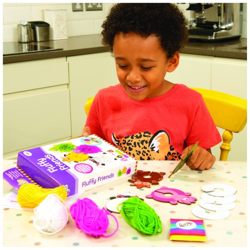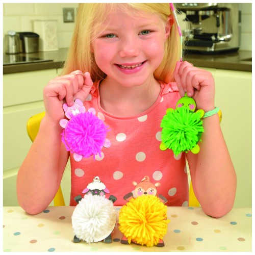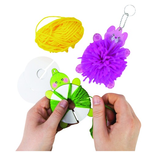 Contents: 4 wooden animal templates, 4 hanks of wool, 4 card circle guides, 4 keyring loops, 4 keyring chains and guide