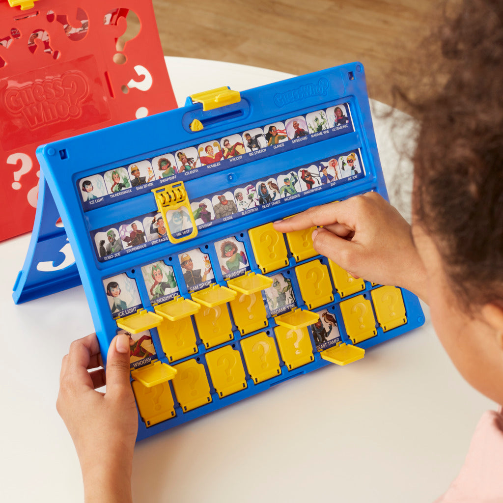 GUESS PEOPLE OR SUPERHEROES: This edition of the Guess Who? game for kids includes 2 sets of double-sided character sheets with classic characters and superhero characters