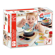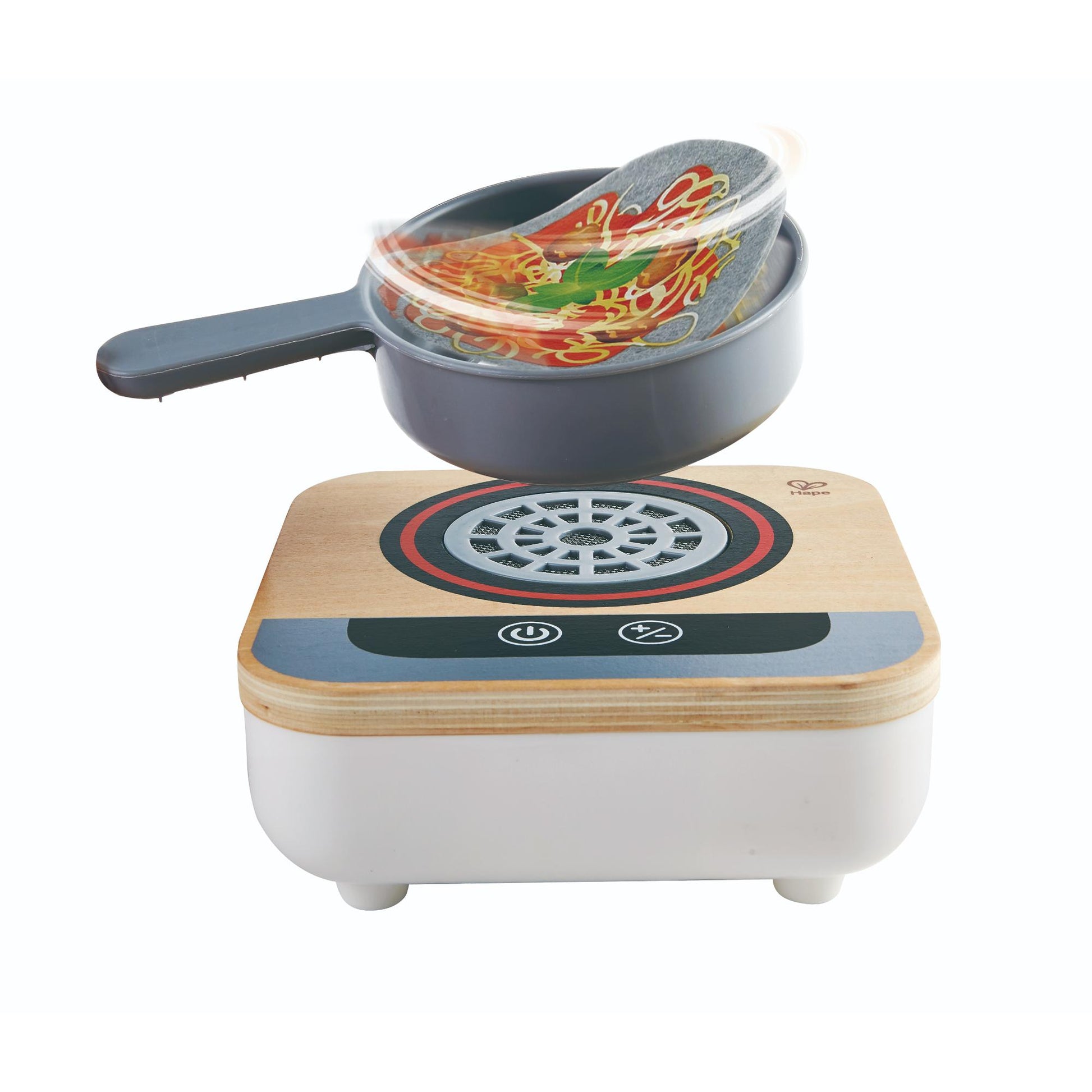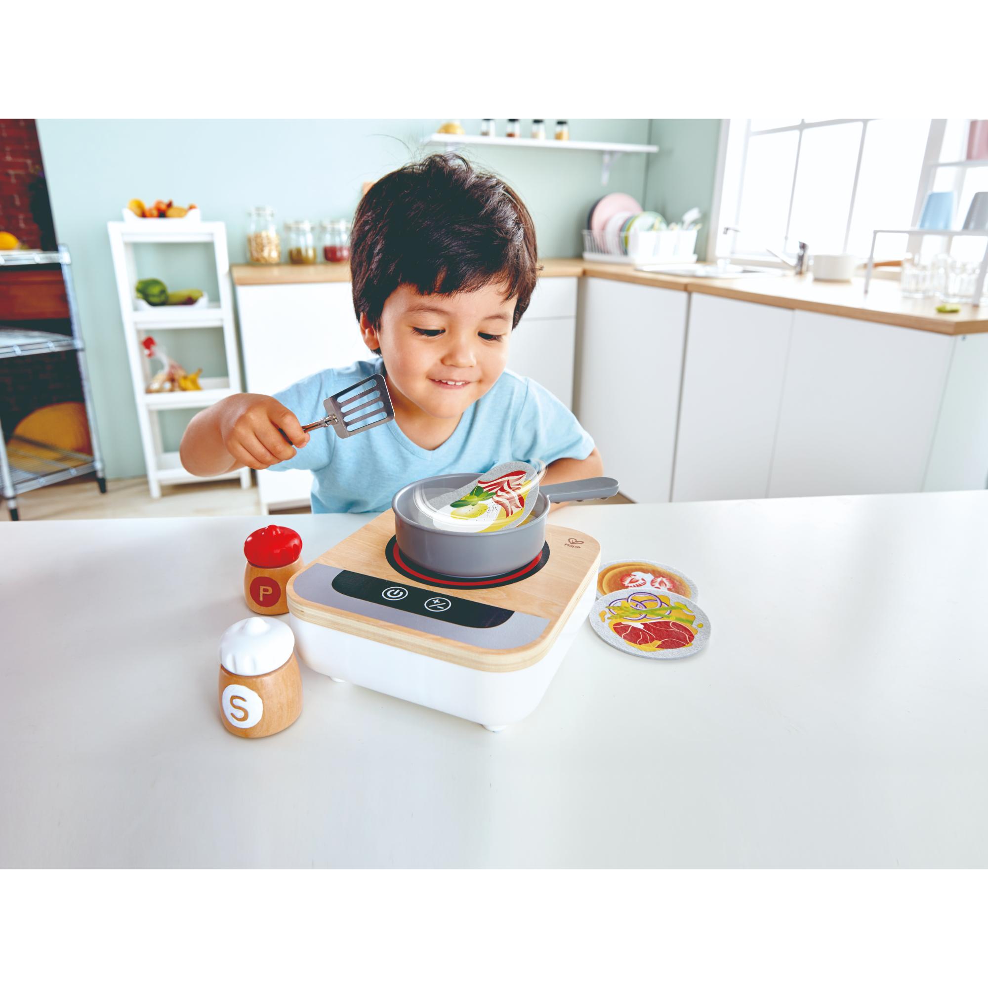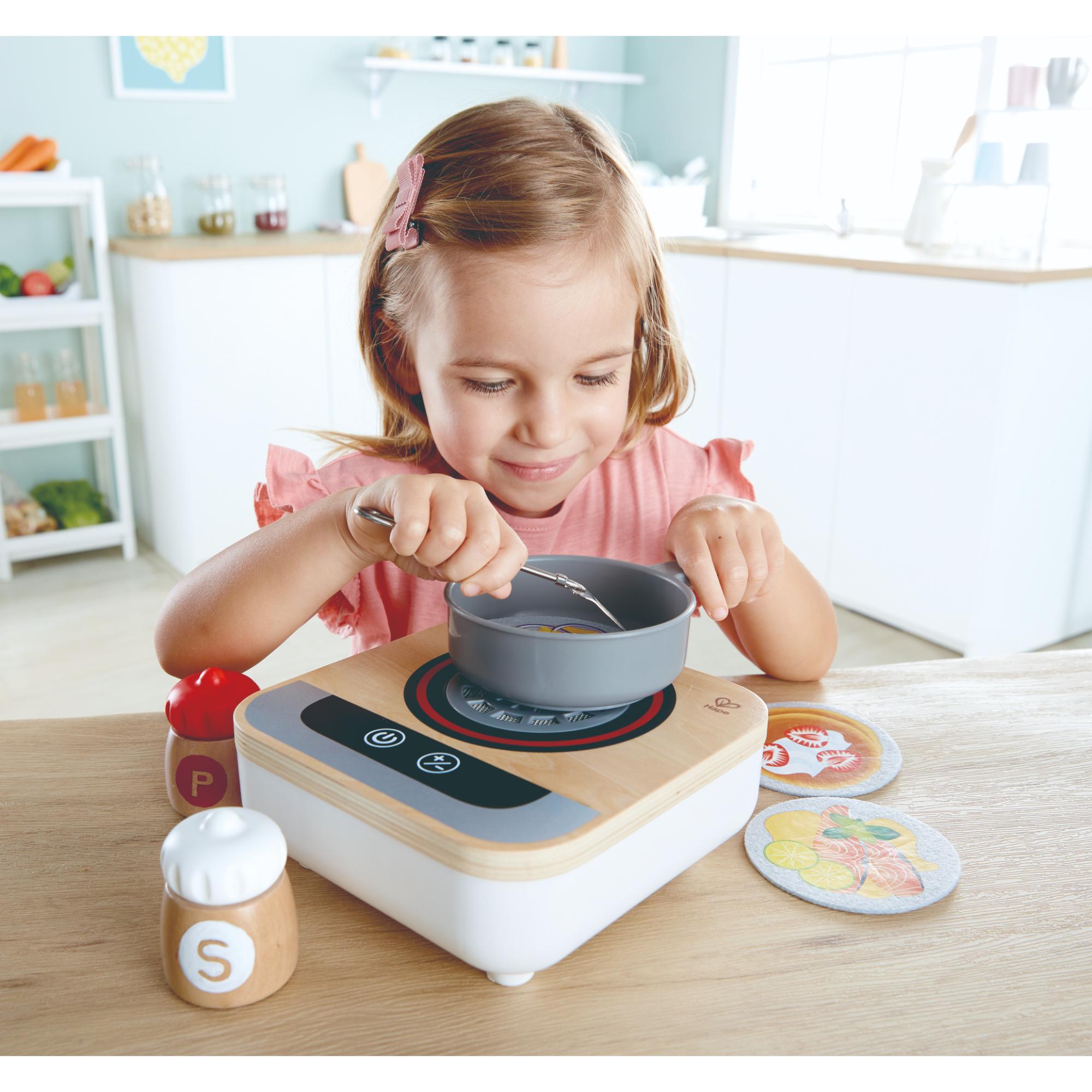 Let your kids practice cooking their favourite meals just like a real chef with this stove and a frying pan. Includes six recipes on three felt discs, one metal spatula, salt and pepper shakers. Enchant kids with their first culinary creations! The wooden toy set features elements like the inbuilt fan, which makes the food turn in the pan, salt and pepper shakers that clicks and turn when you sprinkle on your dishes.