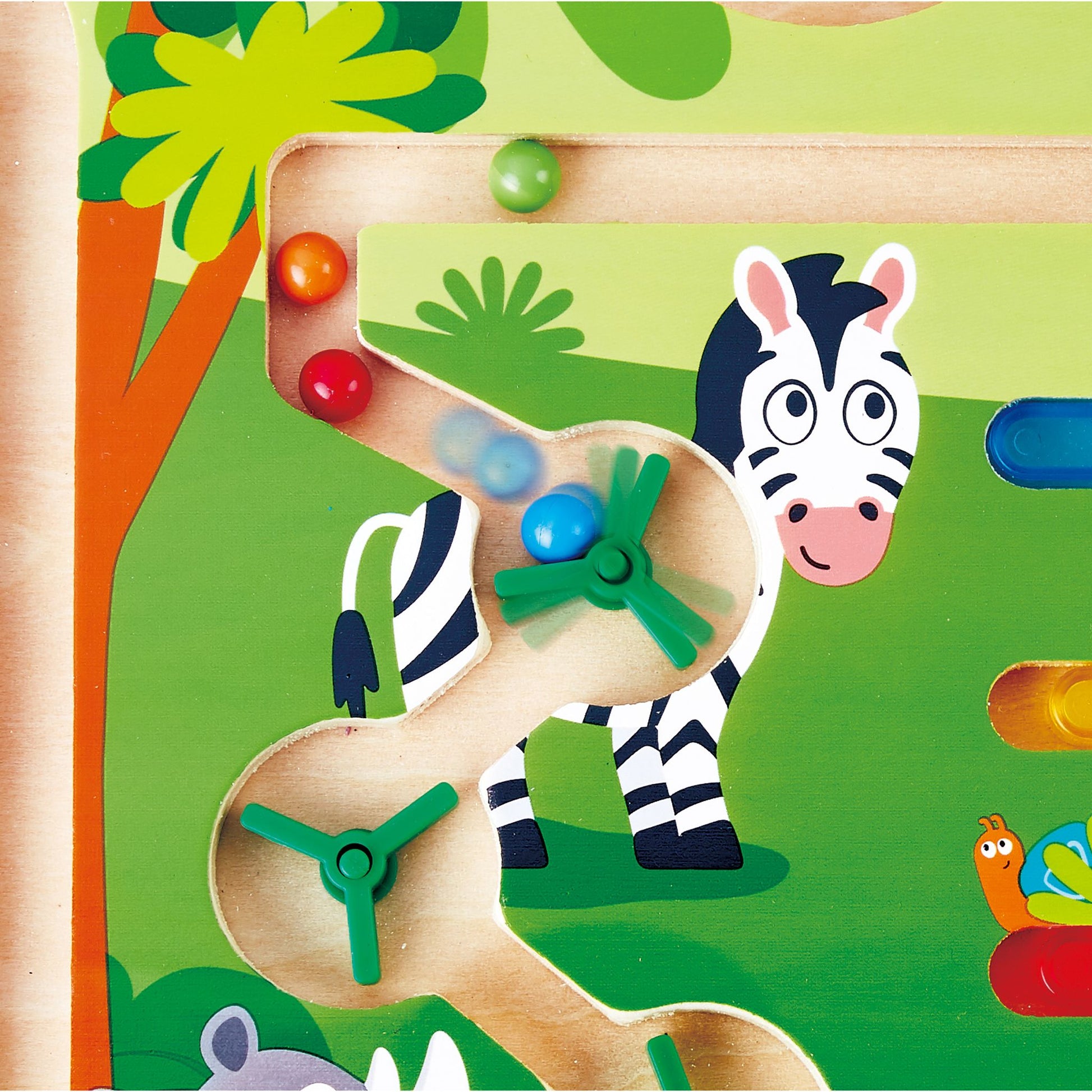 The Hape Jungle Maze great for developing colour recognition, hand-eye coordination and problem-solving skills. Balls are launched with a spring like pinballs. Design features many jungle animals to identify.
