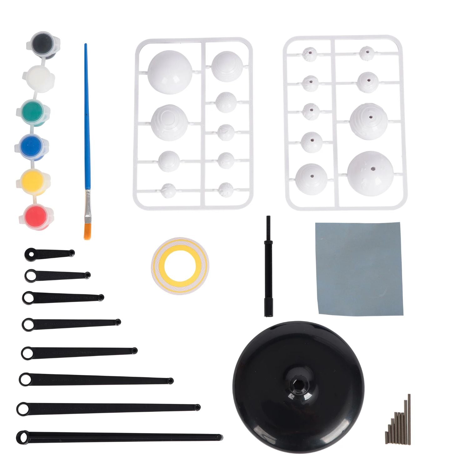 *18 planet pieces, 8 planet arms, base, 6 joints, paint brush, paints and sandpaper