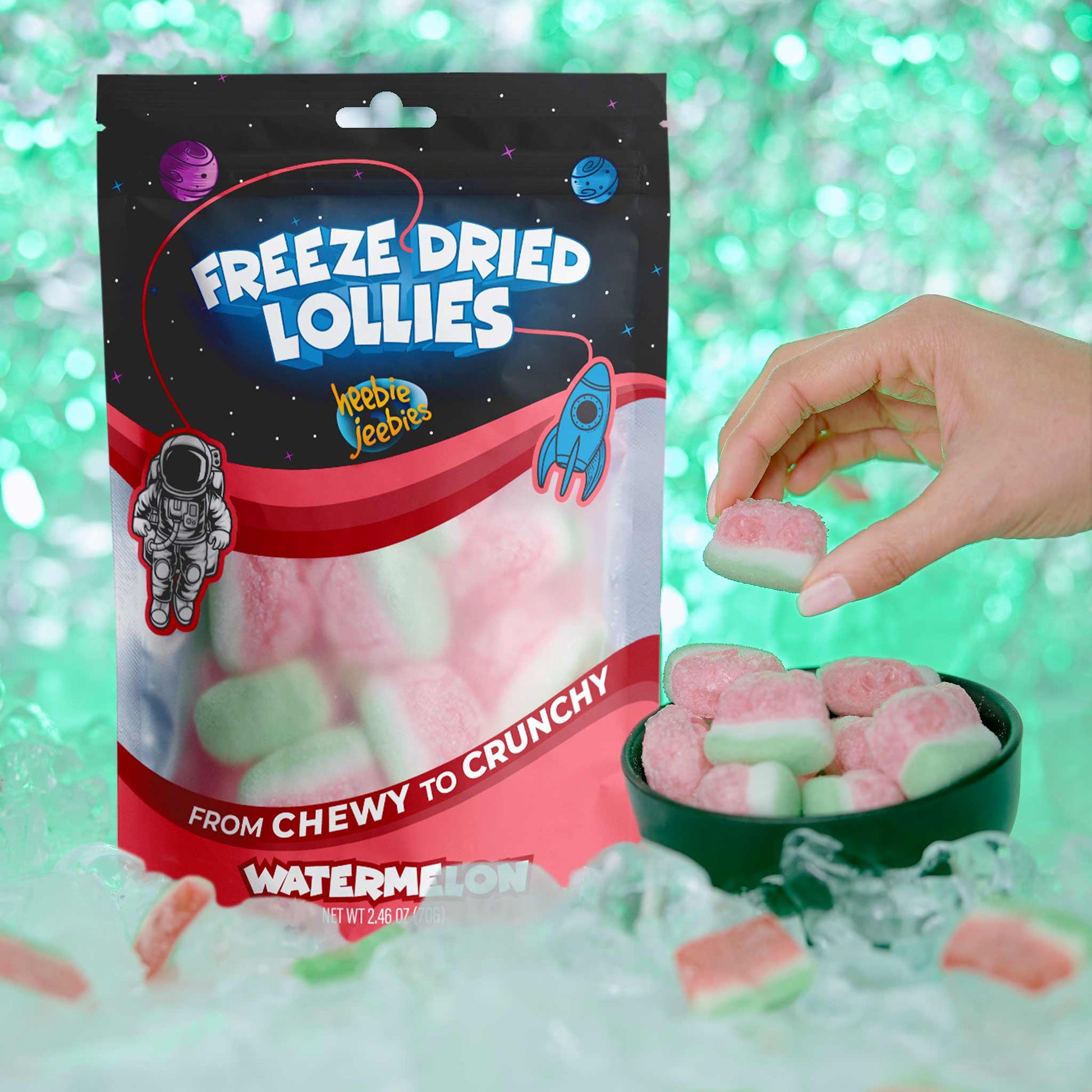Indulge in the science and flavour behind our extraordinary freeze-dried Sour Watermelon candy. With roots in space exploration, we've brought this technology down to Earth to create a treat that's out of this world.