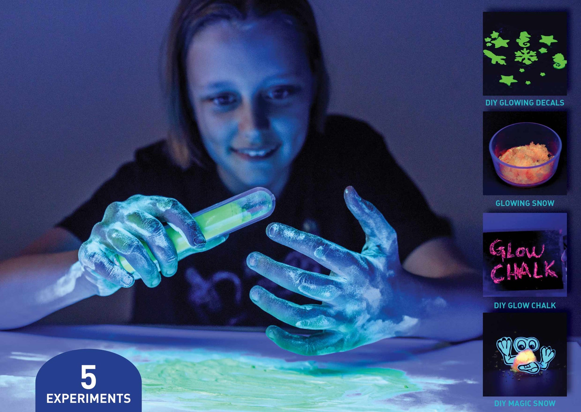 With these 5 unique experiments let your kids make their own glow in the dark chalk, glow stick, and glowing snow using this photoluminescence chemistry kit.