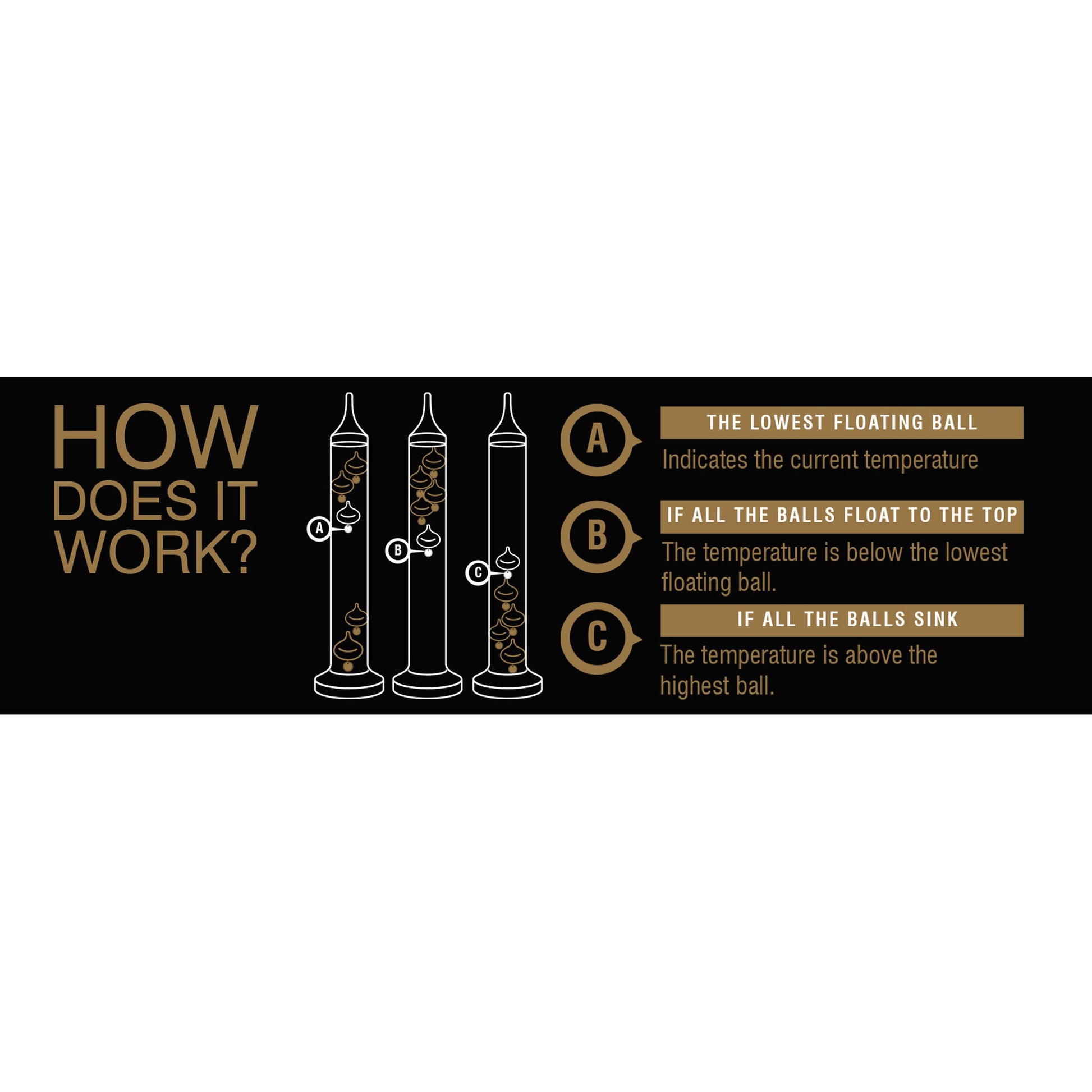 It is a sealed glass cylinder that contains clear liquid and glass bulbs that are all different density. As the temperature changes, the balls rise and fall, giving you a temperature reading. The temperature is read from the engraved metal discs that hang off each bulb – if a bulb is floating in the middle, that is the current temperature, or if some are at the top and some at the bottom the temperature will between the bulbs on either side of the gap.