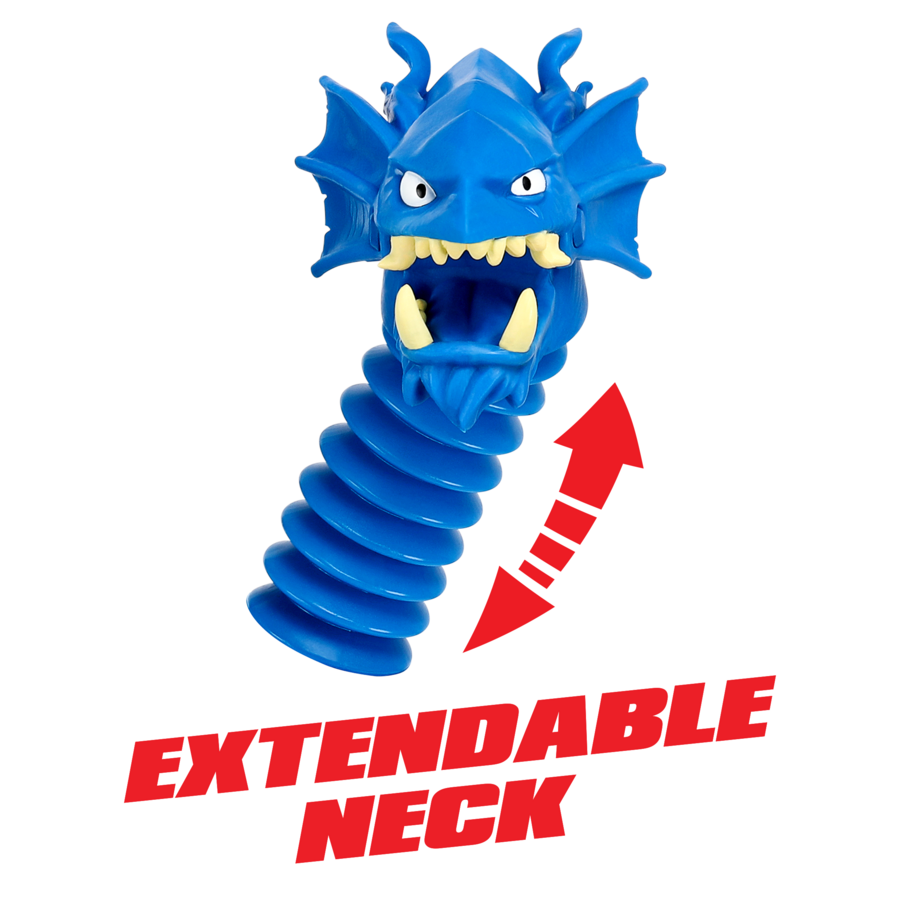 King Hydra is a triple threat with his three heads and different attack features! One head launches a "Blast Attack" by shooting out a projectile from his mouth. Another head stretches out on its extendable neck to reach his target. And his powerful third head roars into action with lights and sounds as he uses his jaws in a "Chomp Attack"!